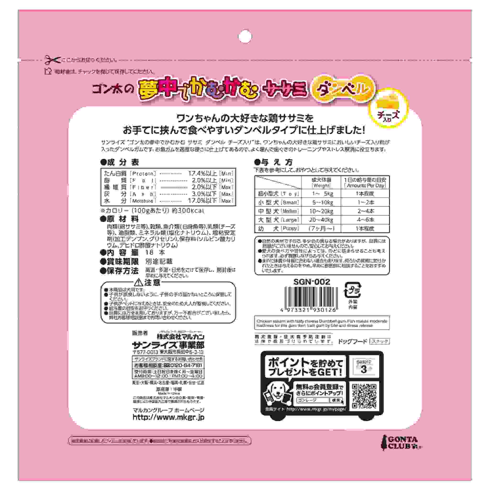 ワンちゃんの大好きな鶏ササミにおいしいチーズ入り粒が入ったダンベルガムです。