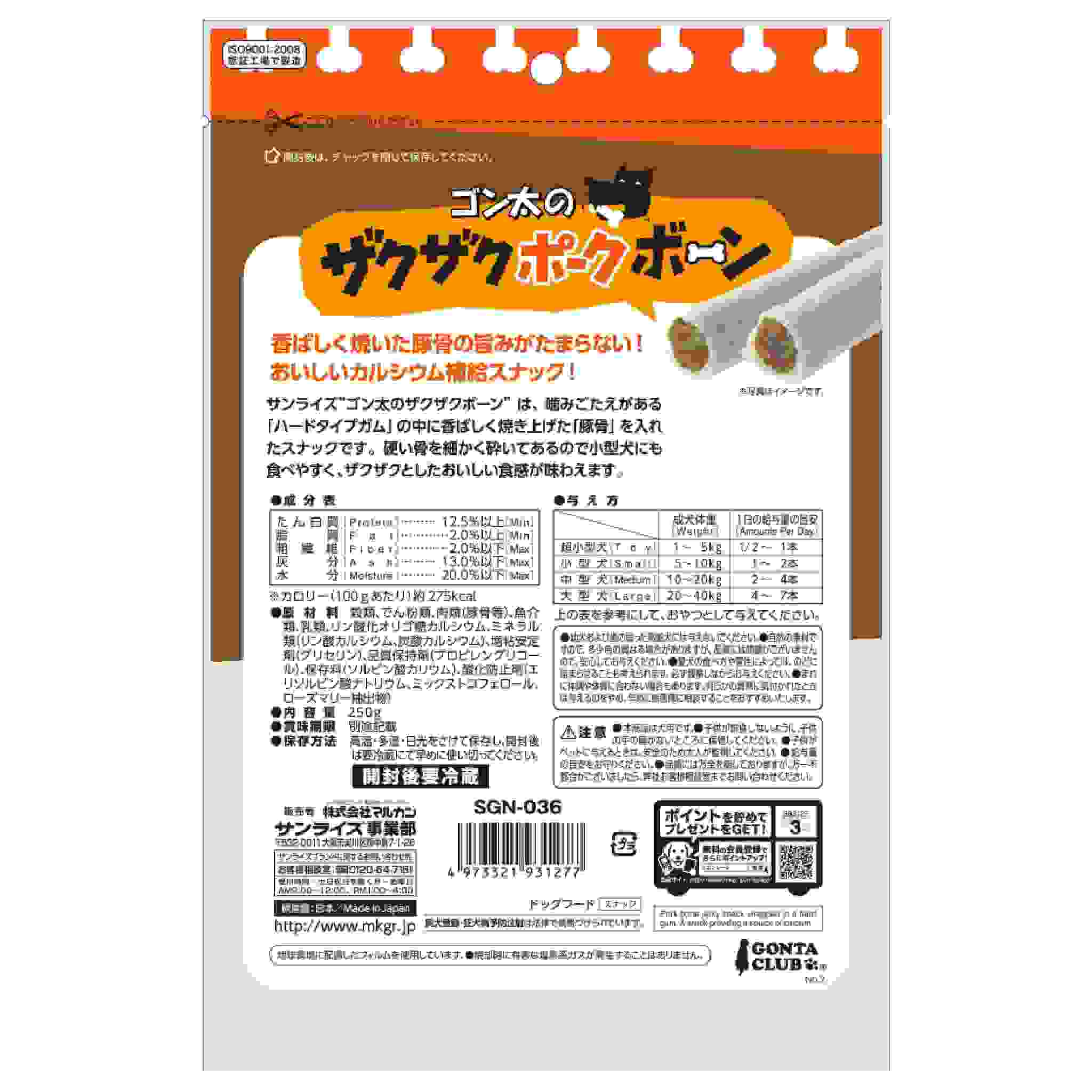 噛みごたえがある「ハードタイプガム」の中に、香ばしく焼き上げた「豚骨」を入れたスナックです。硬い骨を細かく砕いてあるので小型犬にも食べやすく、ザクザクとしたおいしい食感が味わえます。