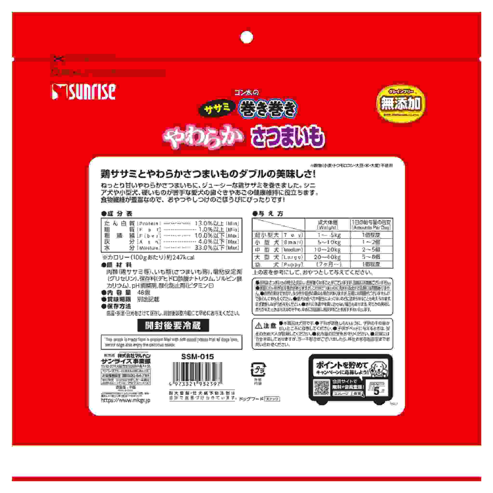 やわらかく仕上げた甘みたっぷりのさつまいもにしっとりササミを巻いた、嗜好性の高いスナックです。さつまいもに含まれる食物繊維でワンちゃんのお腹の健康サポート。手軽に与えられるので、おやつやしつけのごほうびにおすすめです。