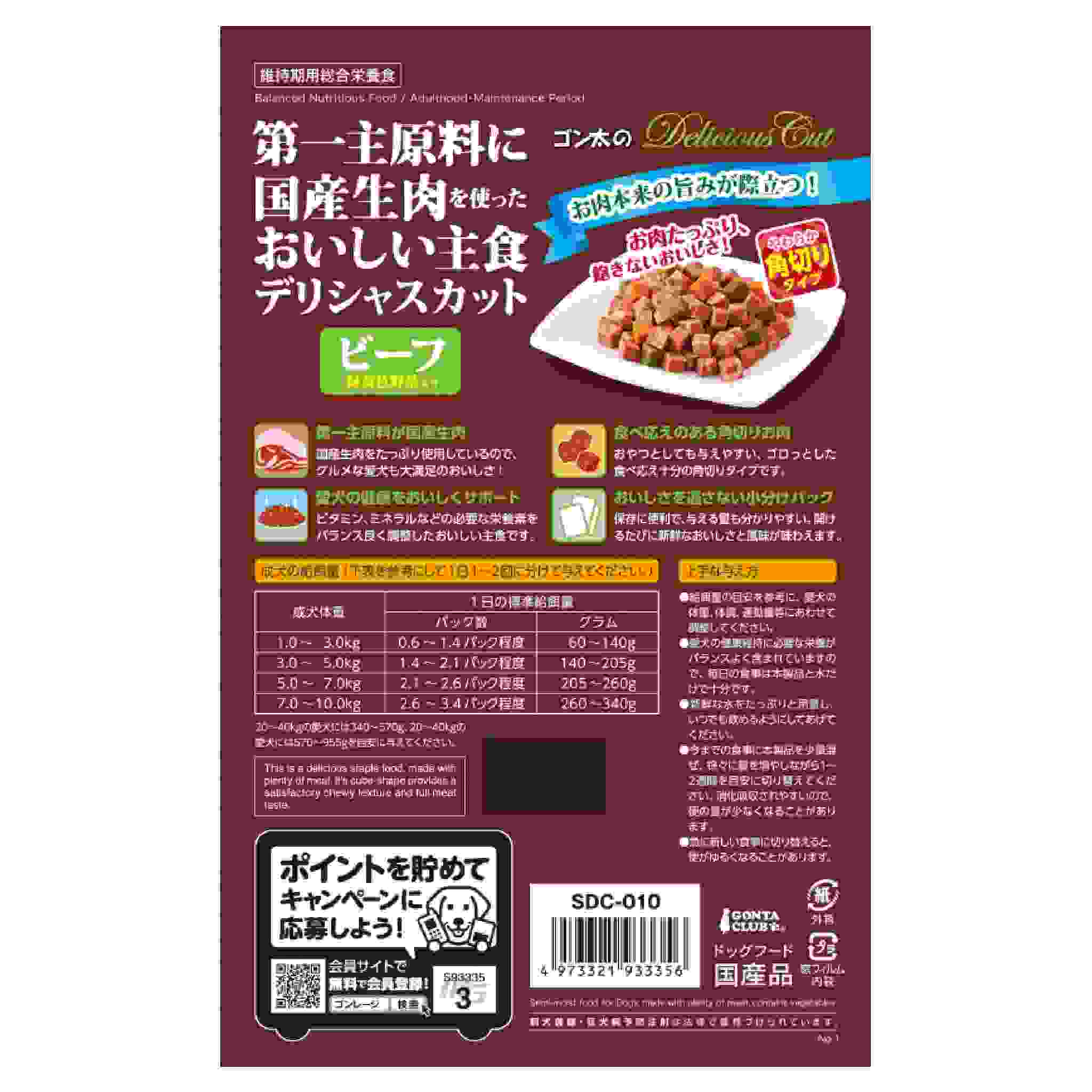 お肉と野菜の栄養バランス!ビタミン、ミネラルなどの必要な栄養素をバランス良く調整したおいしい主食です。国産生肉を第一主原料に使用しているので、グルメな愛犬も大満足のおいしさです。ゴロっとした満足感のある食べ応えの角切り粒で、噛んで広がるお肉の旨みが味わえます。