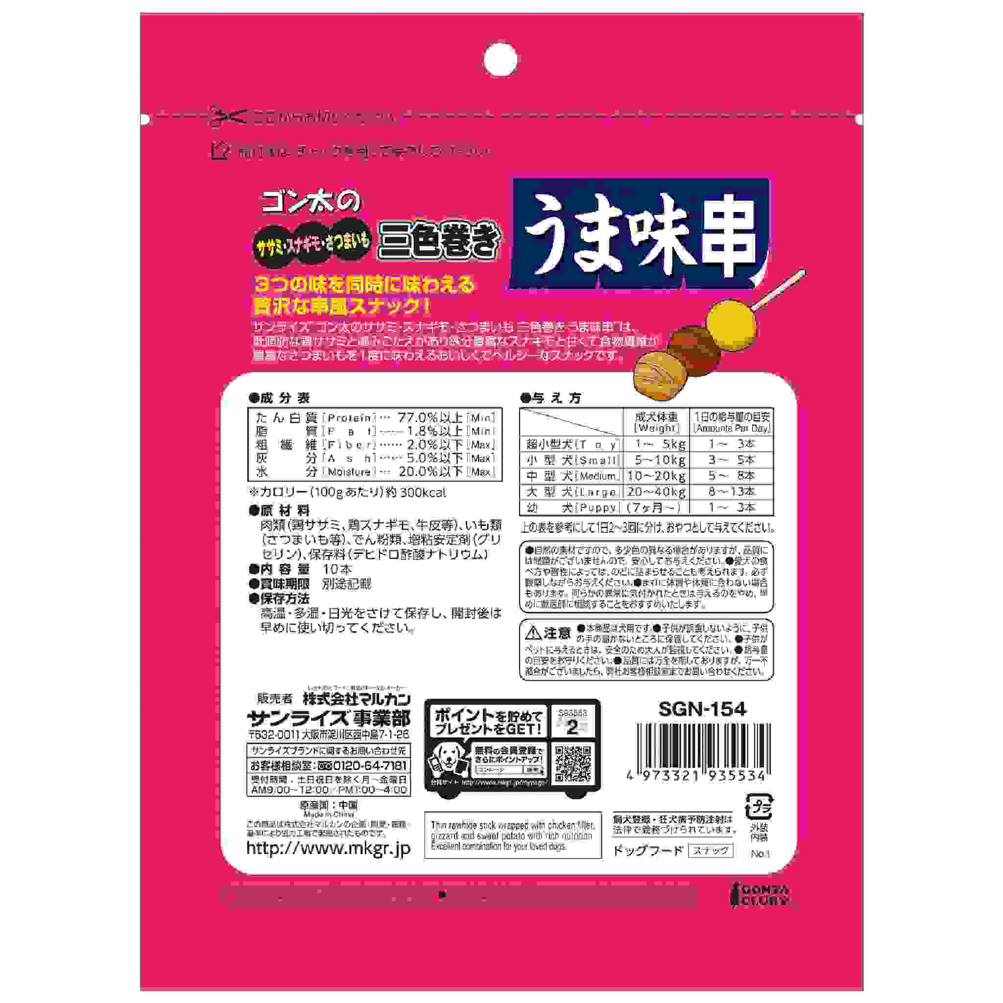 低脂肪な鶏ササミと噛みごたえがあり鉄分豊富なスナギモと甘くて食物繊維が豊富なさつまいもを1度に味わえるおいしくてヘルシーなスナックです。 食べやすい極細タイプだから小型犬や硬いおやつが苦手なワンちゃんにも安心して与える事ができます。
