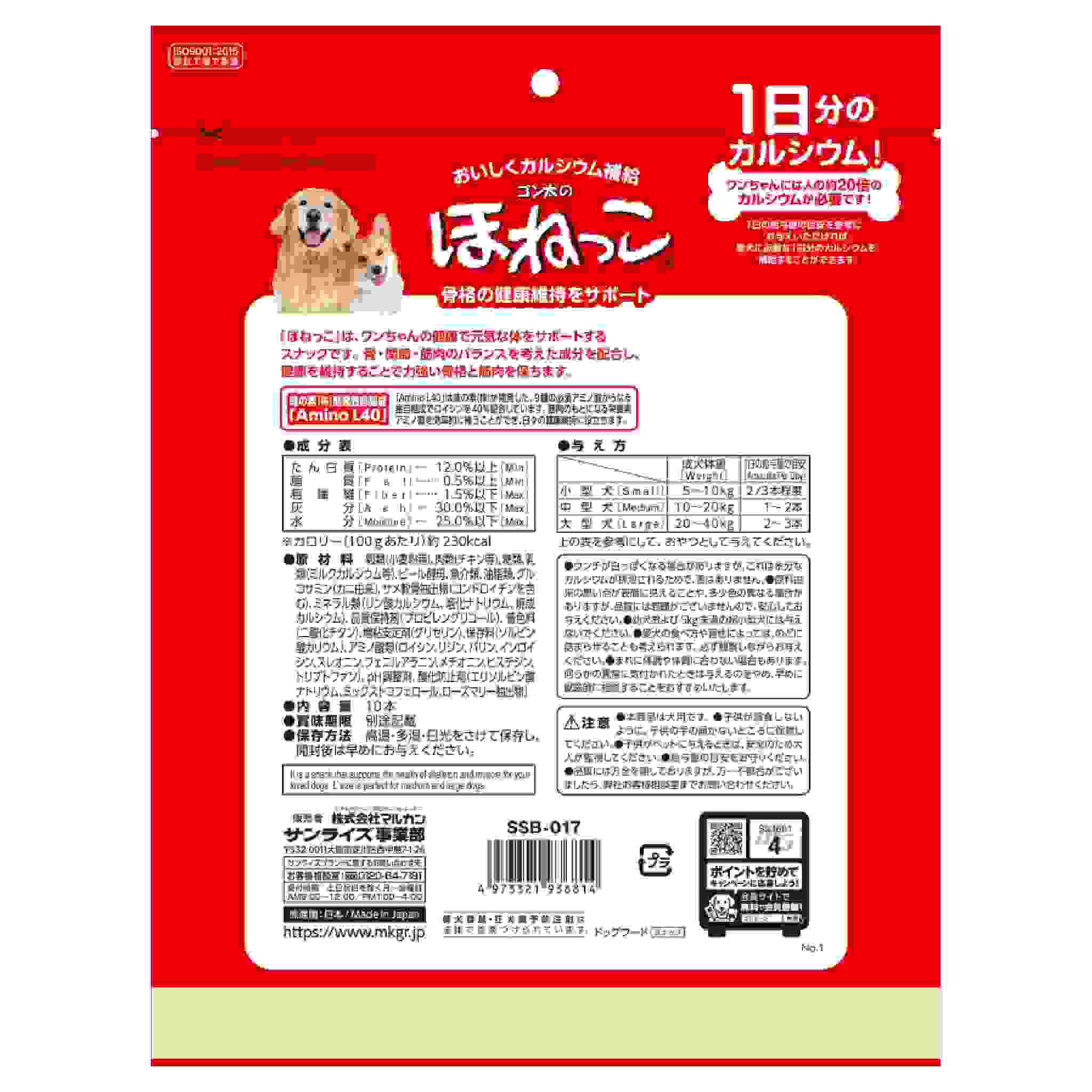たん白質・・・12.0%以上、脂質・・・0.5%以上、粗繊維・・・1.5%以下、灰分・・・30.0%以下、水分・・・25.0%以下