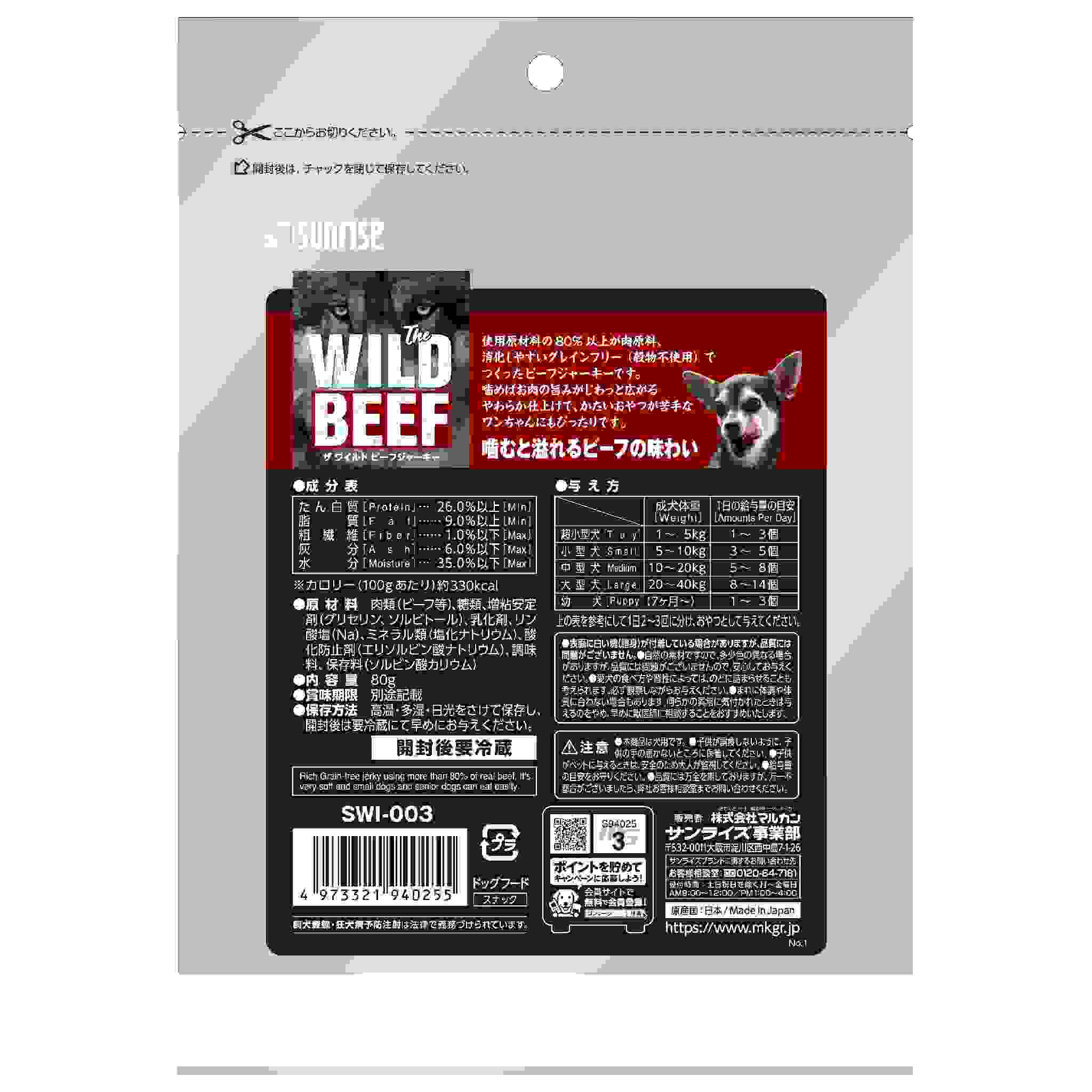 使用原材料の80%以上が肉類、穀物不使用(グレインフリー)でつくったビーフジャーキーです。噛めばお肉の旨みがじわっと広がります。