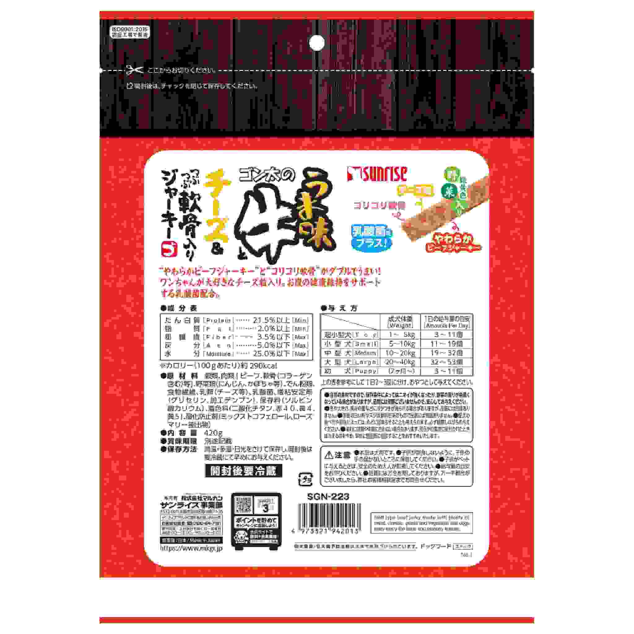 お肉をたっぷり使ったチーズ粒入りビーフジャーキーのおいしさと軟骨のコリコリした食感がダブルで味わうことができる嗜好性の高いスナックです。