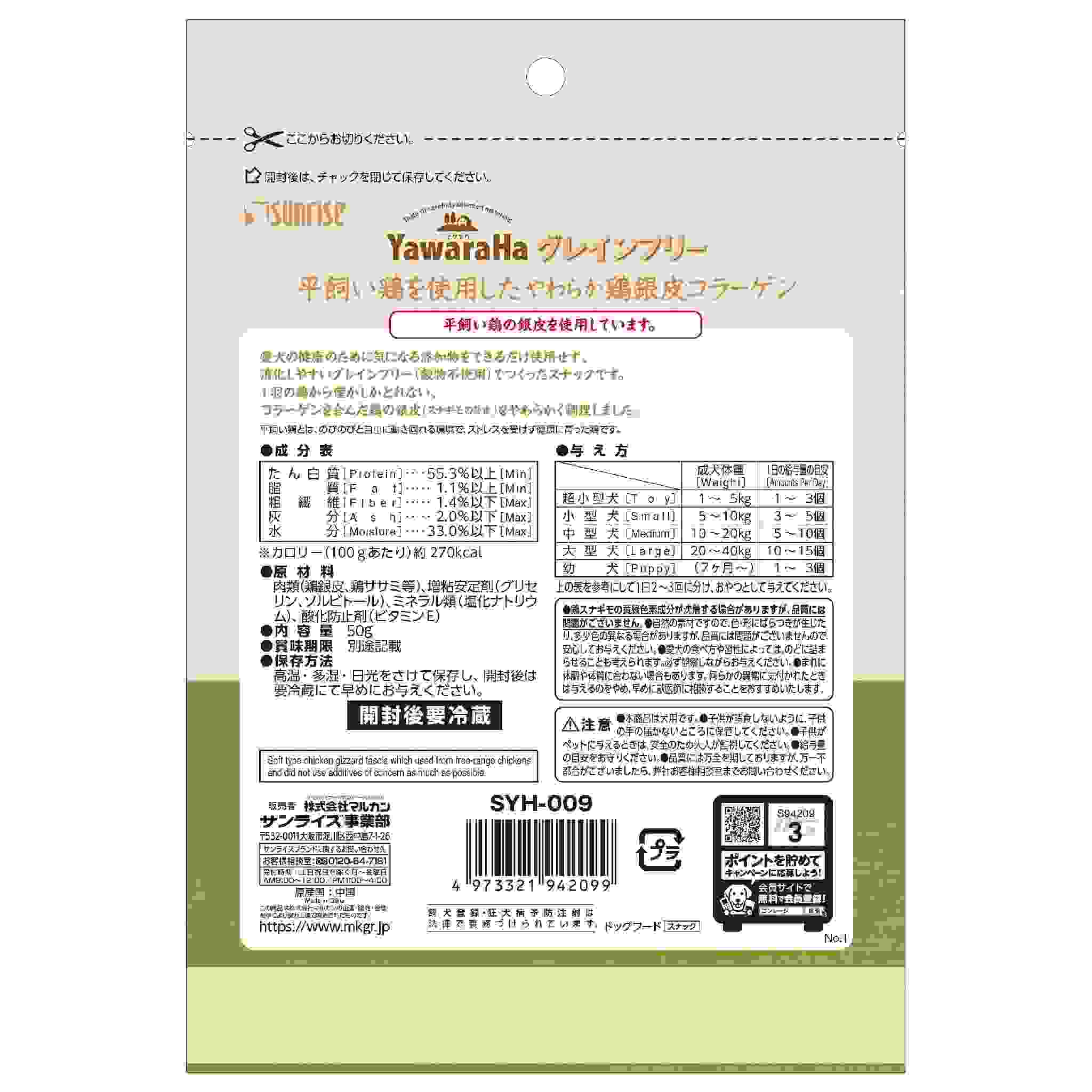愛犬の健康のために気になる添加物をできるだけ使用せず、消化しやすいグレインフリー(穀物不使用)でつくったスナックです。1羽の鶏から僅かしかとれない、コラーゲンを含んだ鶏の銀皮(スナギモの薄皮)をやわらかく調理しました。