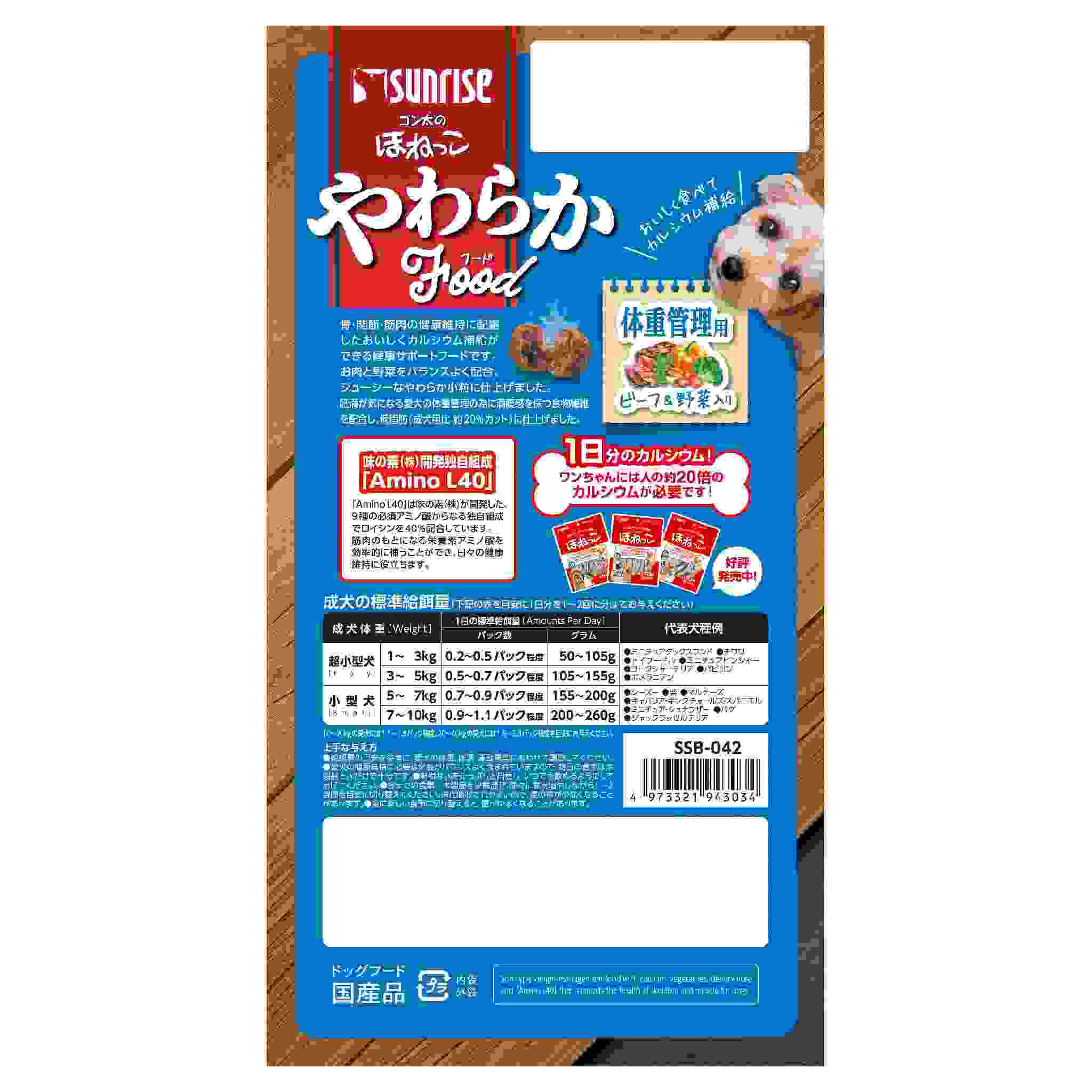 お肉と野菜をバランスよく配合、ジューシーなやわらか小粒に仕上げました。骨・関節・筋肉の健康維持に配慮したおいしくカルシウム補給ができる健康サポートフードです。肥満が気になる愛犬の体重管理の為に満腹感を保つ食物繊維を配合し、低脂肪(成犬用比 約20%カット)に仕上げました。