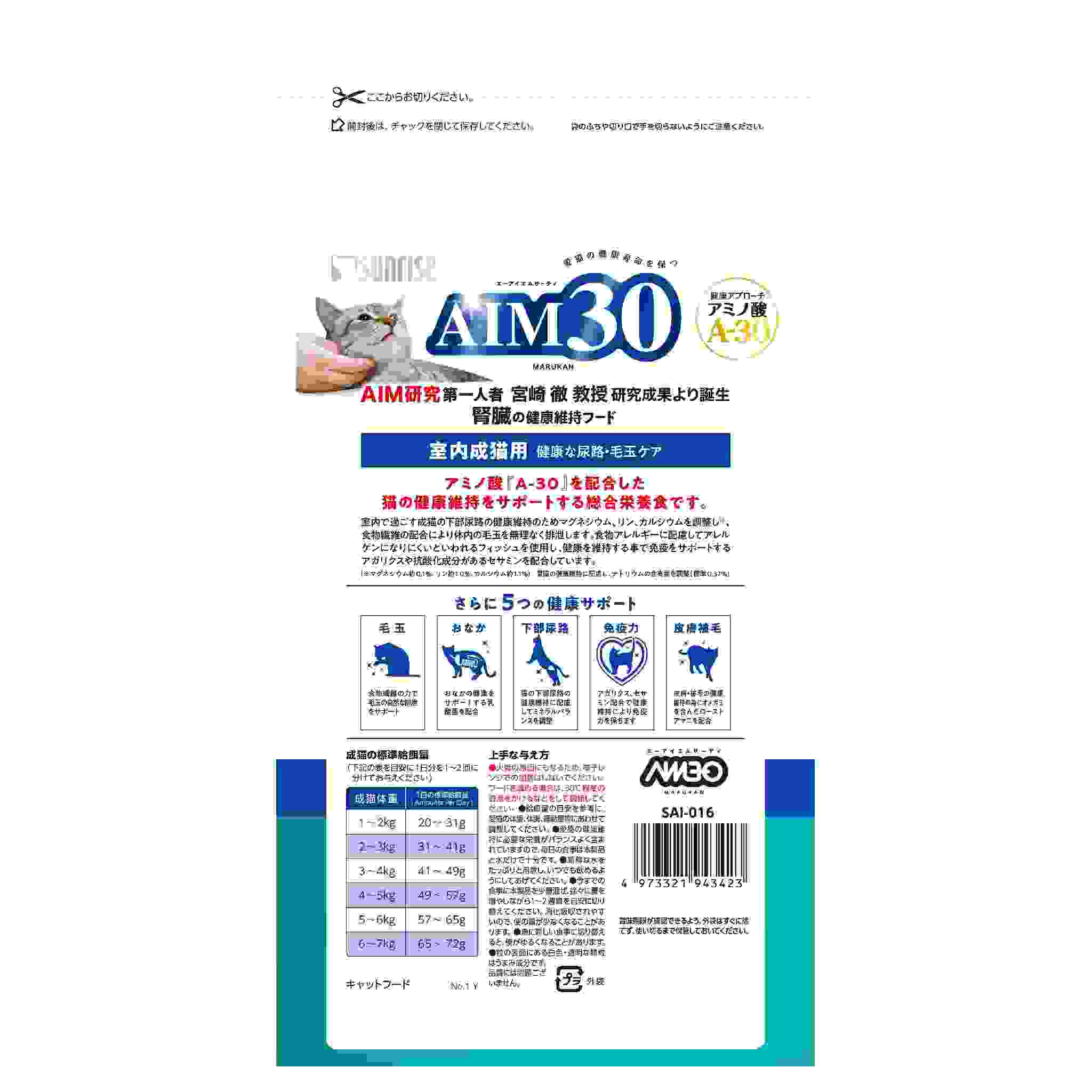 アミノ酸『A-30 』を配合した猫の健康維持をサポートする総合栄養食です。 室内で過ごす成猫の下部尿路の健康維持のためマグネシウム、リン、カルシウムを調整し※、食物繊維の配合により体内の毛玉を無理なく排泄します。食物アレルギーに配慮してアレルゲンになりにくいといわれるフィッシュを使用し、健康を維持する事で免疫をサポートするアガリクスや抗酸化成分があるセサミンを配合しています。(※マグネシウム約0.1%、リン約1.0%、カルシウム約1.1%) 腎臓の健康維持に配慮し、ナトリウムの含有量を調整(標準0.37%)