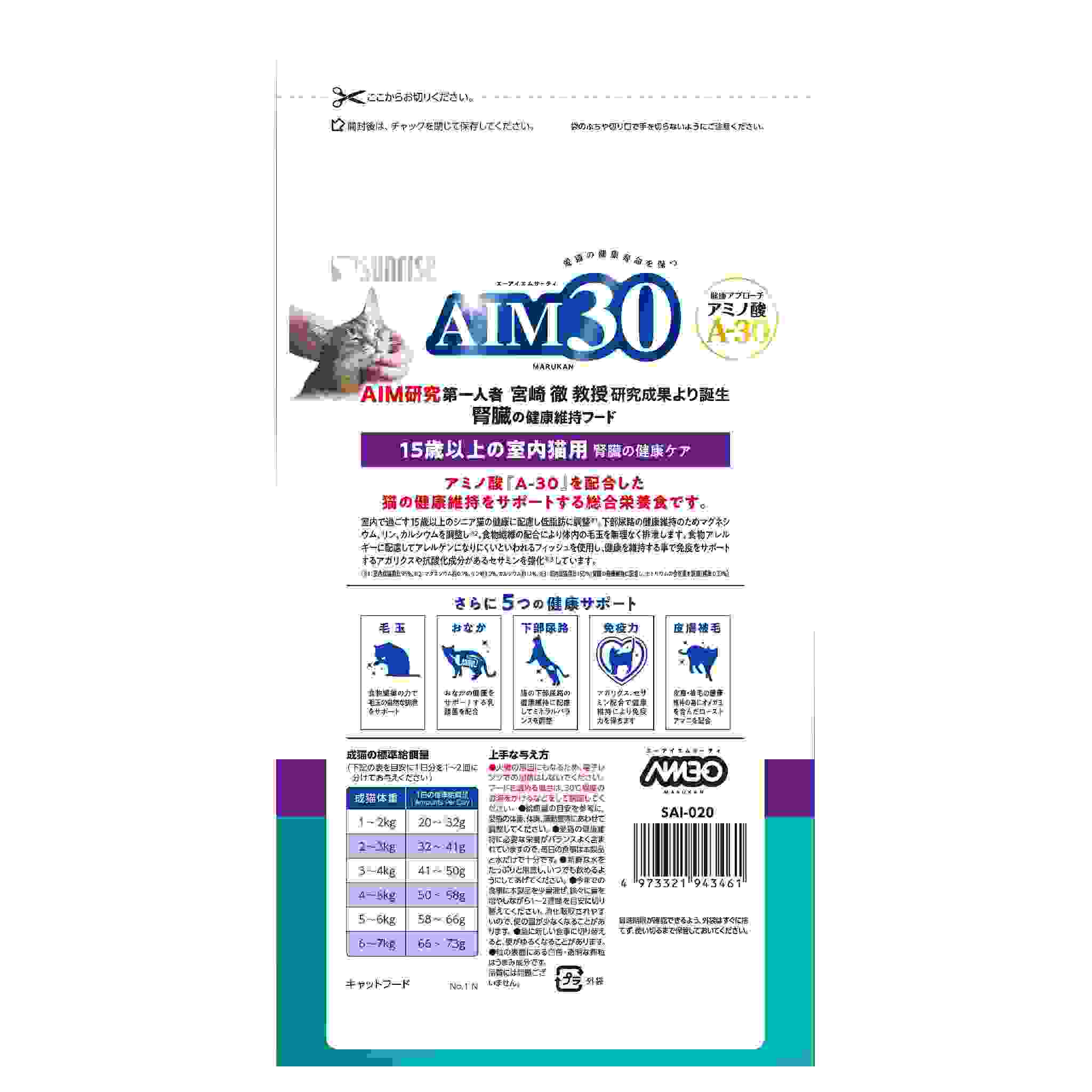 アミノ酸『A-30 』を配合した猫の健康維持をサポートする総合栄養食です。 室内で過ごす15歳以上のシニア猫の健康に配慮し低脂肪に調整※1。下部尿路の健康維持のためマグネシウム、リン、カルシウムを調整し※2、食物繊維の配合により体内の毛玉を無理なく排泄します。食物アレルギーに配慮してアレルゲンになりにくいといわれるフィッシュを使用し、健康を維持する事で免疫をサポートするアガリクスや抗酸化成分があるセサミンを強化※3しています。(※1:室内成猫用比95%、※2:マグネシウム約0.1%、リン約1.0%、カルシウム約1.1%、※3:室内成猫用比150%) 腎臓の健康維持に配慮し、ナトリウムの含有量を調整(標準0.37%)