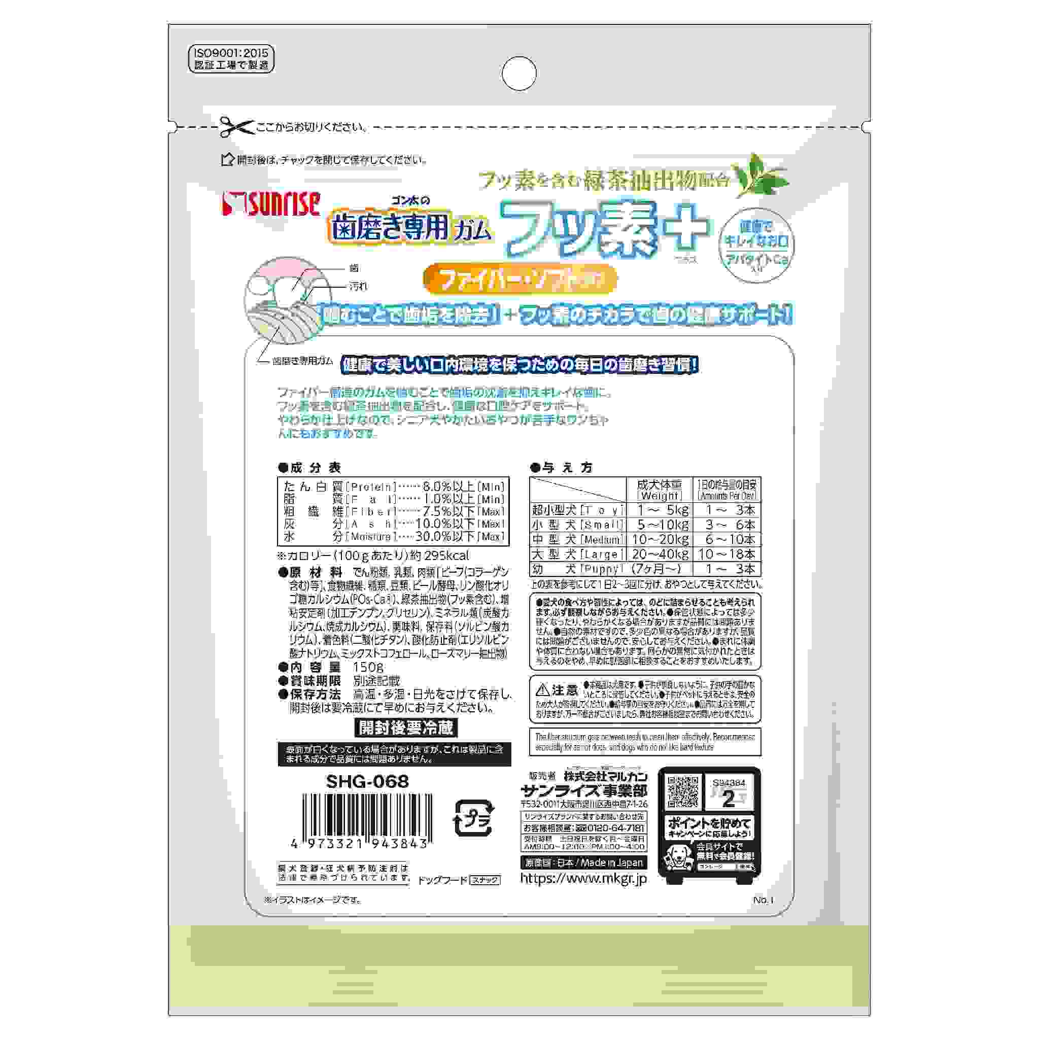 噛むことで歯垢を除去+フッ素のチカラで歯の健康サポート!健康で美しい口内環境を保つための毎日の歯磨き習慣!ファイバー構造のガムを噛むことで歯垢の沈着を抑えキレイな歯に。フッ素を含む緑茶抽出物を配合し、健康な口腔ケアをサポート。やわらか仕上げなので、シニア犬やかたいおやつが苦手なワンちゃんにもおすすめです。