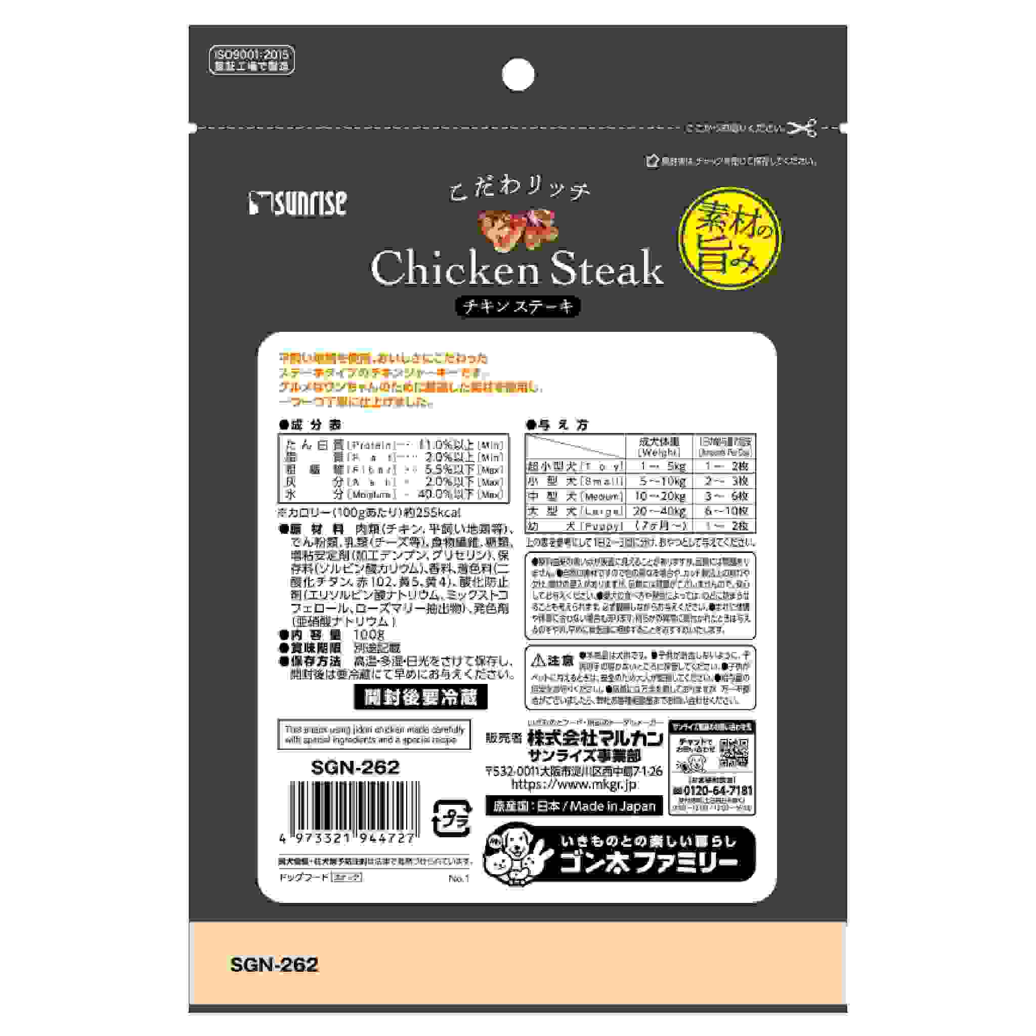 グルメなワンちゃんのために厳選した素材を使用し、おいしさにこだわったステーキタイプのチキンジャーキーです。