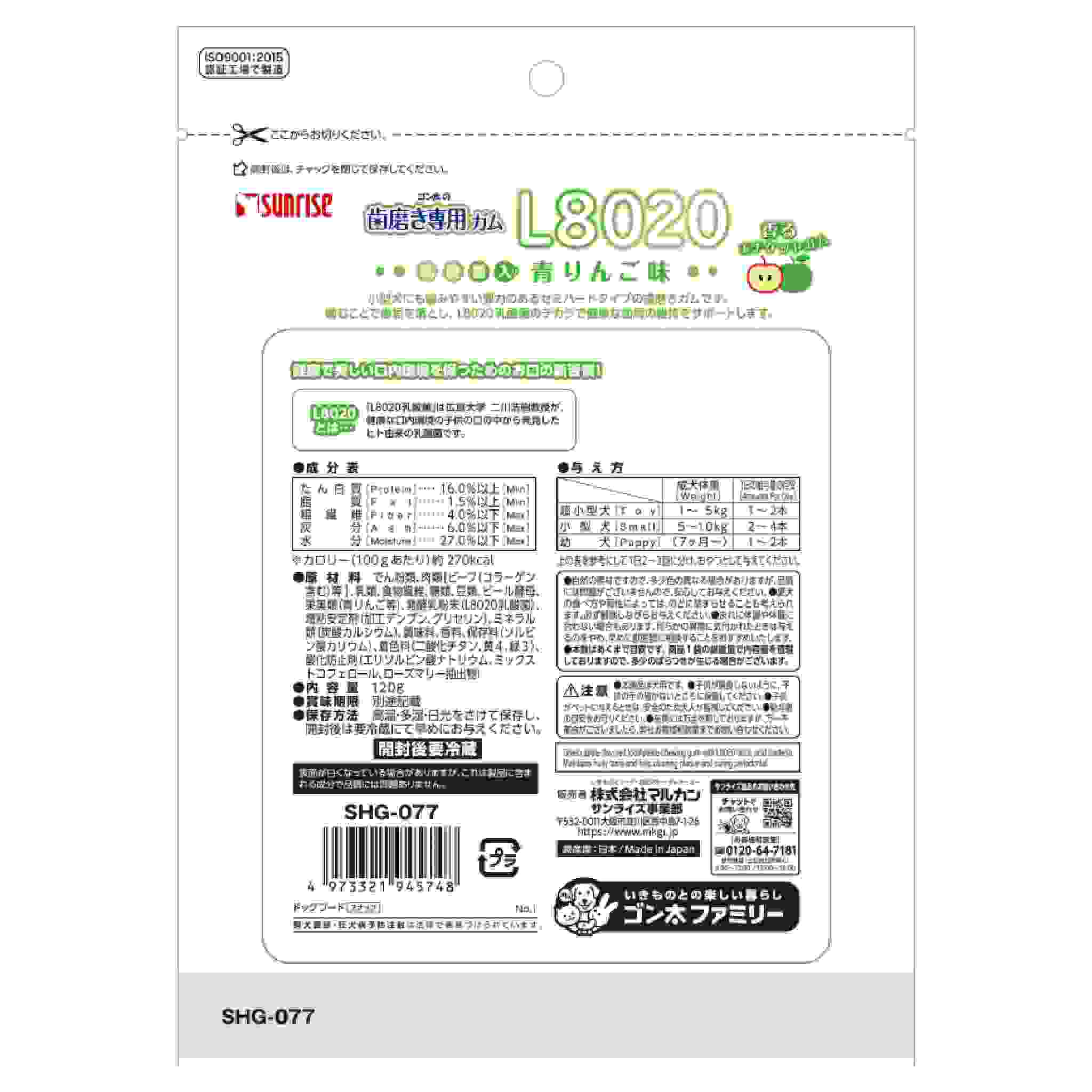 小型犬にも噛みやすい弾力のあるセミハードタイプの歯磨きガムです。噛むことで歯垢を落とし、L8020乳酸菌のチカラで健康な歯周の維持をサポートします。お口がさわやかに香る青りんご味。