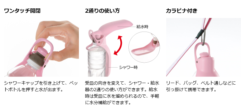 ペットボトルに取り付けるだけ! 外出時に便利なマナー水洗&給水器の2WAY。 シャワーキャップを引き上げペットボトルを押すだけで使えます。 シャワー、給水器の2通りの使い方ができます。