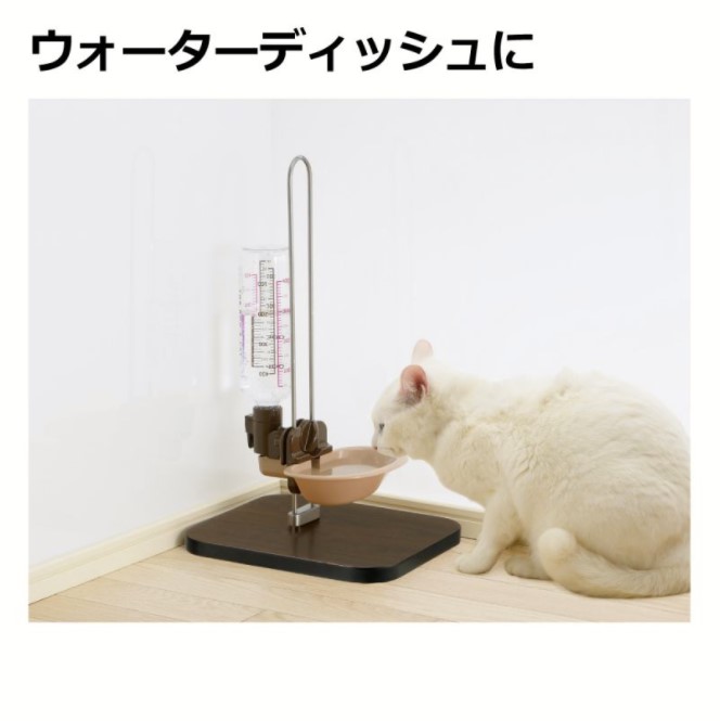 ケージやサークルが無くても、給水器を取り付けられるスタンドです。ゴム脚付きなので、ずれにくく床をキズつけません。木目調なので、インテリアに調和します。
