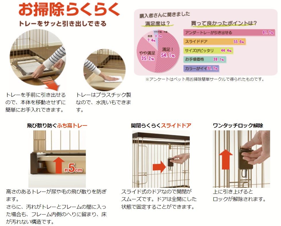 超小型犬・小型犬用体重目安 8kg以下サイズ 本体:87×61×60H(cm) 開口部:31.5×44.5(cm)製品重量 9kg材質 木部:天然木(ラッカー塗装) ワイヤー:スチール(ポリエステル塗装) 滑り部材・トレー・ドアロック:ABS樹脂 ゴム脚:熱可塑性エラストマー