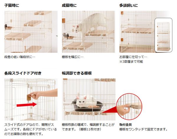 飼い始めにぴったり。 成長に合わせてカスタマイズ可能! 子猫時に、成猫時に、多頭飼いに… 棚板の位置を組み替えて、お好みの空間づくりができます。