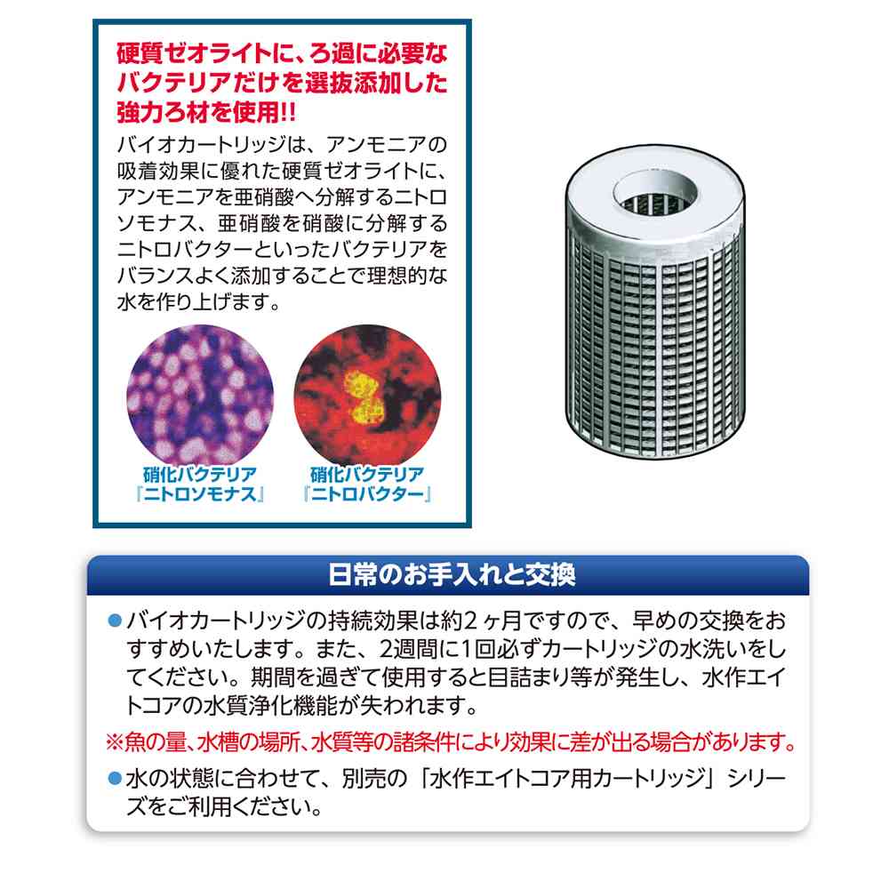 水作エイトS専用のバクテリアカートリッジです。高機能特殊活性炭セラミックにろ過に必要なバクテリアだけを選別添加した強力ろ過材を使用しています。アンモニアを亜硝酸を分解するニトロソモナス、亜硝酸を硝酸に分解するニトロバクターといったバクテリアをバランスよく添加することで、安定した水質を維持しやすくします。持続効果は約2ヶ月です。