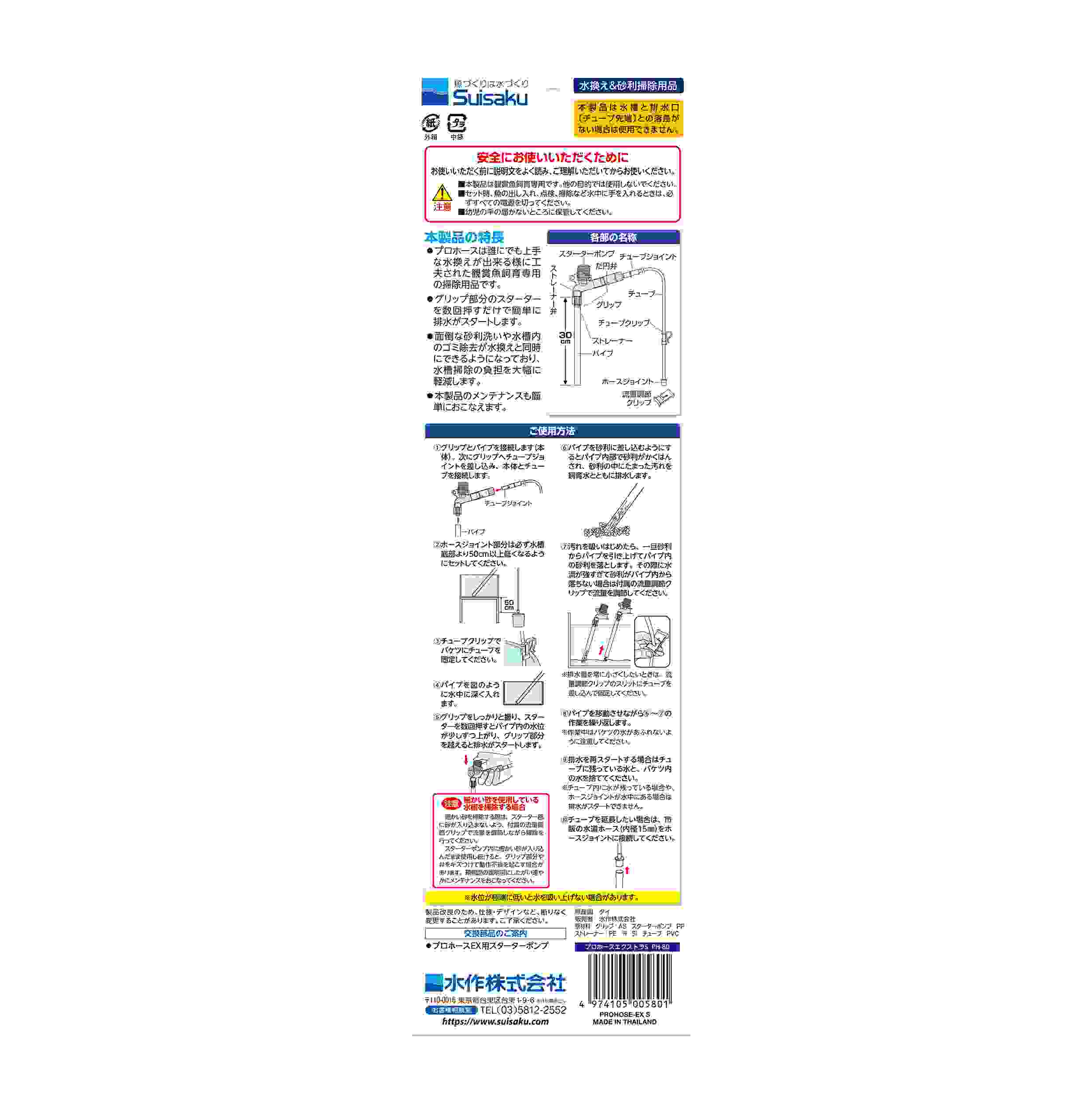 ●砂利はそのまま、ゴミだけを古くなった飼育水と一緒にかんたん排出。●グリップ部分のスターターポンプを数回押すだけで簡単に排水がスタートし、水槽内のレイアウトを崩すことなく観賞魚や水草にもやさしい水換えを実現します。●水槽サイズや砂利の種類にあわせて排水のスピードを調節することも可能です。●パイプを底砂に差し込むだけで砂利の中の老廃物を古くなった飼育水と一緒に排水します。●本製品は水槽と排水口(チューブ先端)の落差がない場合は使用できません。