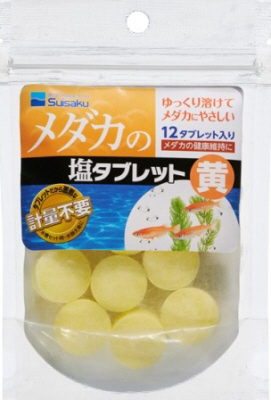 軽量不要のタブレットタイプの塩。水槽に入れるだけでメダカの健康維持し、ミネラルを供給。