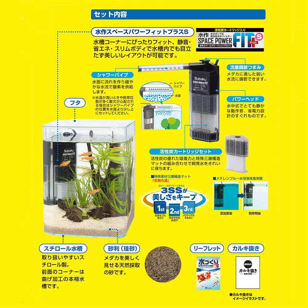 セット内容:水槽・フタ・フィルター・砂利(珪砂)・カルキヌキ・小冊子。