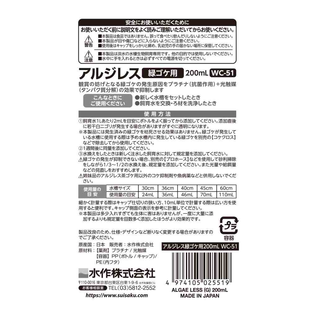 ●本製品は淡水の水棲生物飼育専用につき他の目的で使用しない事。
