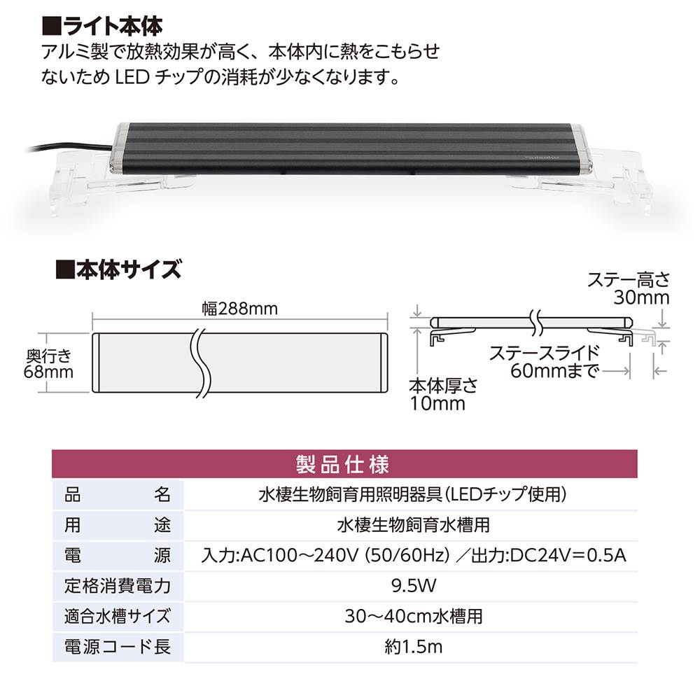 バランス良い明るい光源でベースライティングに最適なLEDライトのベーシックモデル、スライド式ステーで30~40cm水槽、ガラス厚6mmまで対応。