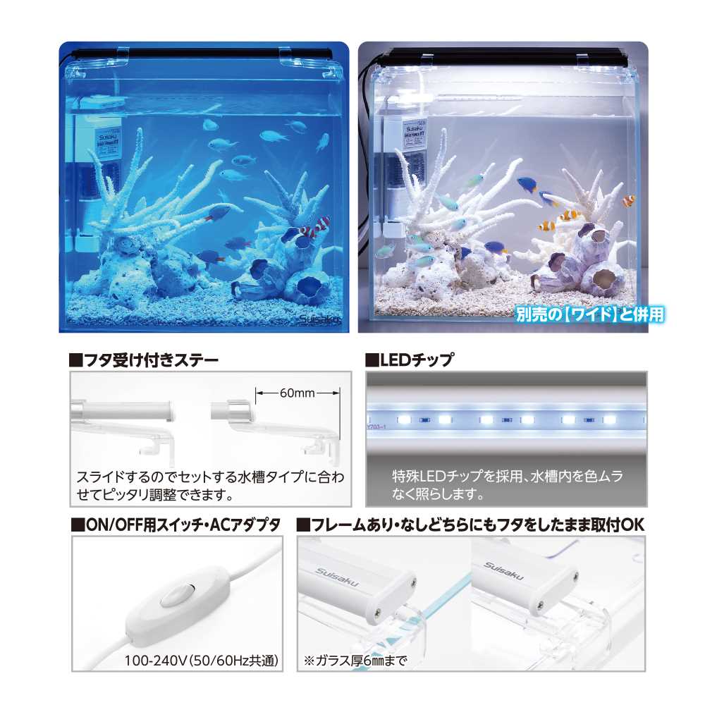 水野透明感を強調する青い光源のLEDライト、スライド式ステーで30~40cm水槽、ガラス厚6mmまで対応。