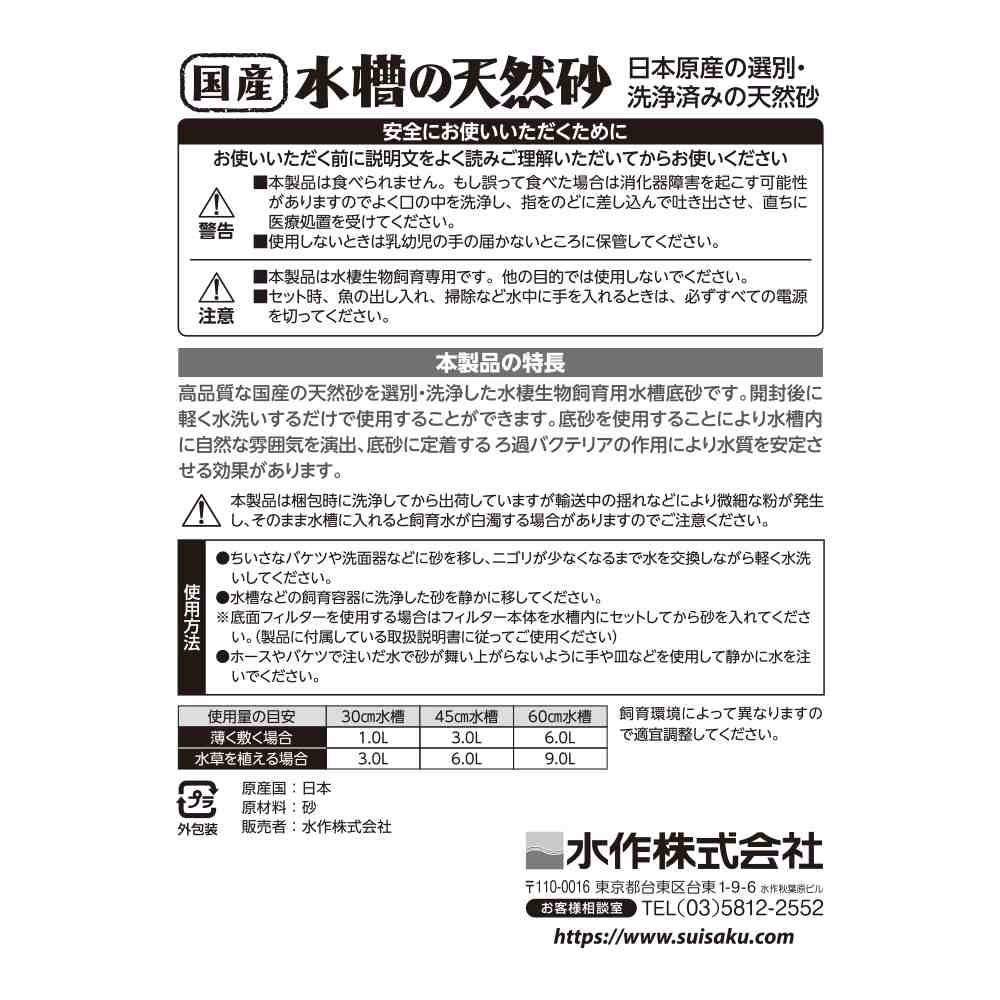国内採取の天然砂、洗浄&選別済で軽い水洗い後すぐに使用できる水棲生物用底砂。