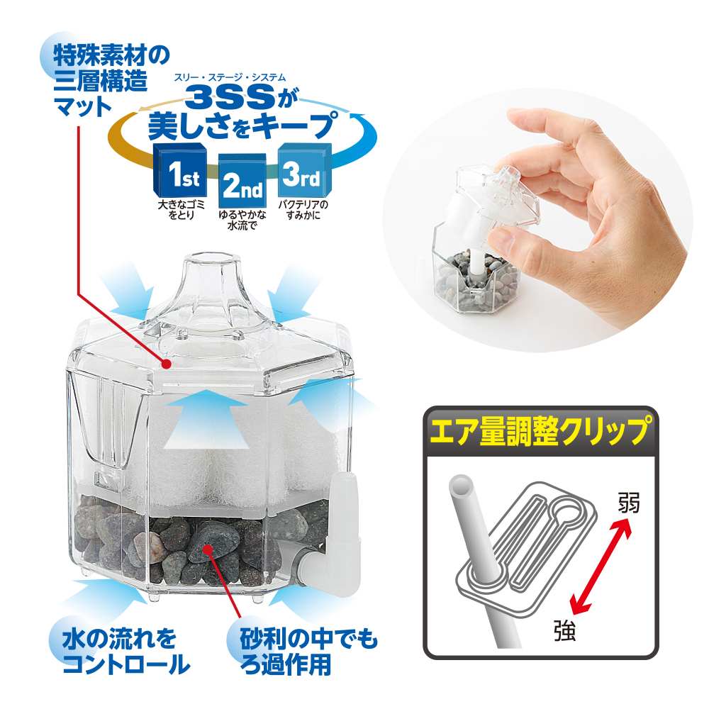 コンパクトな本体のエアリフト式フィルター、チューブ、エア調整クリップ付き。