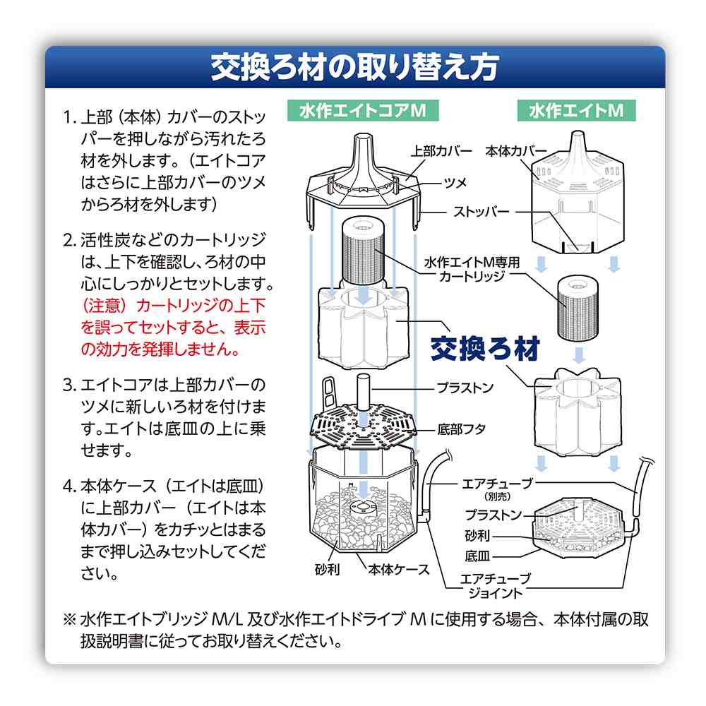 ろ材が目詰まりしたら交換時期、エイト/エイトコア/ドライブ/ダストラップ/ブリッジの各Mサイズ対応。