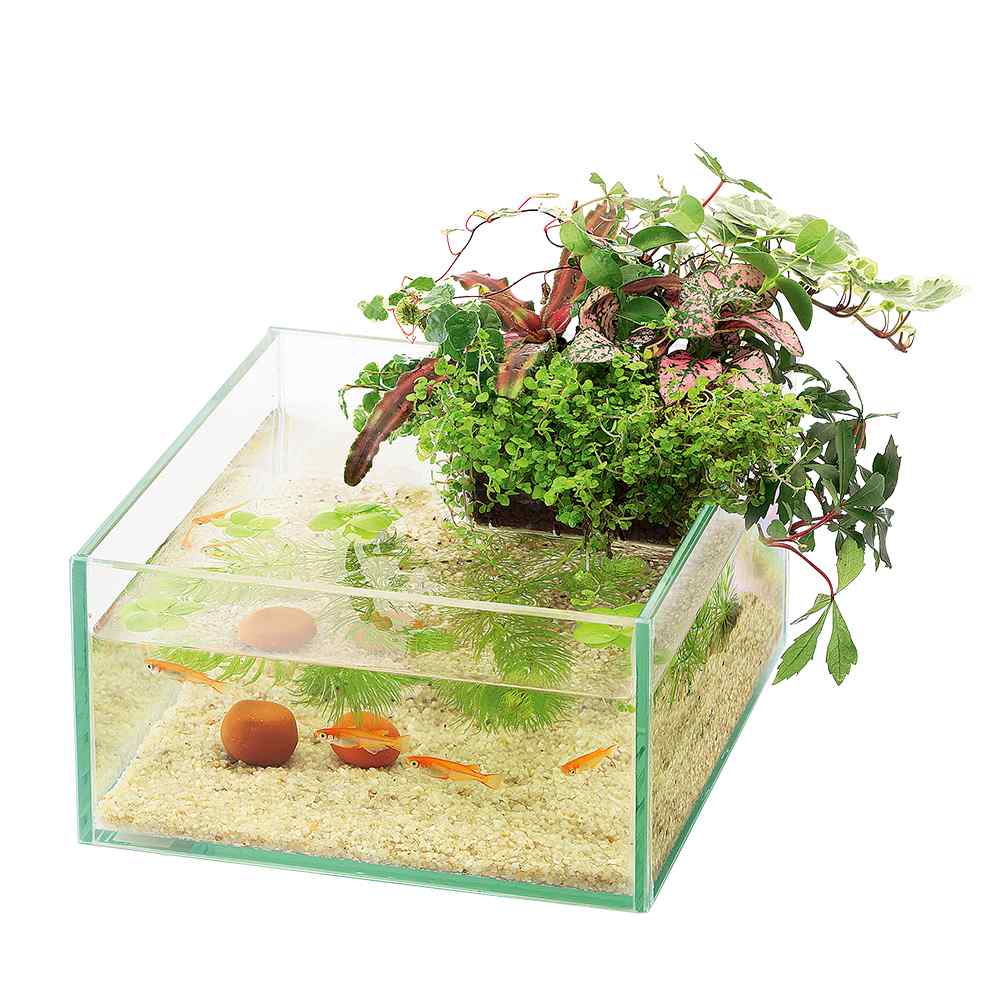 フラットデザインのガラス水槽と植物育成プランターのセット、メダカの飼育と観葉植物の育成が同時に楽しめる。セット内容:水槽・保護マット・専用プランター・植込み材・アクアテリアストーン・砂利・カルキヌキ・エサ。