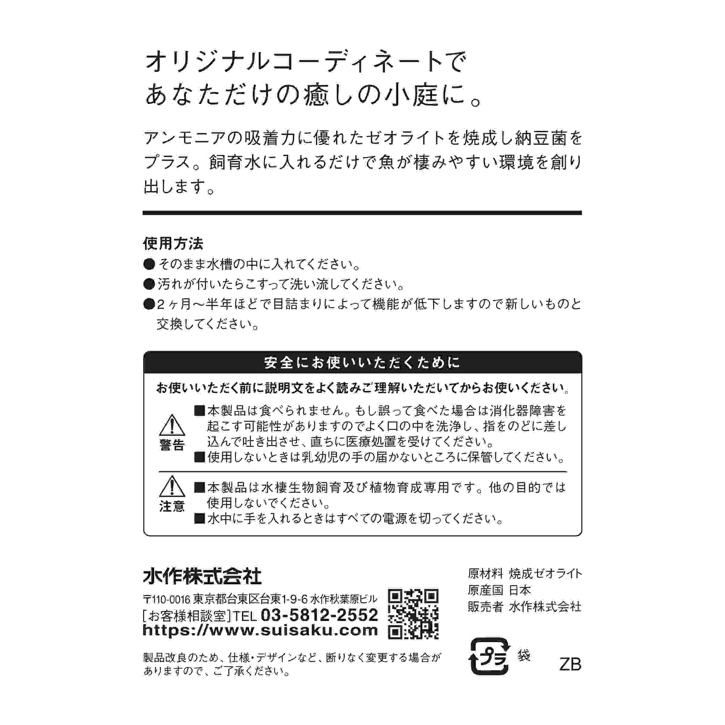 アンモニアの吸着効果に優れたゼオライトとミネラル添加効果のある麦飯石を焼成、さらに納豆菌を追加し水づくりを促進する。