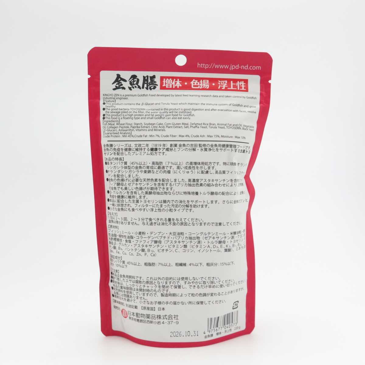 ●高タンパク質(45%以上)・高脂肪(7%以上)の高増体用処方です。特に琉金・オランダシシガシラ体型の金魚の育成に最適です。高い成長性を示します。●オランダシシガシラや東錦などの肉瘤(にくりゅう)に配慮し、高品質フィッシュコラーゲンを配合しました。●金魚の色揚げに必要な天然色素を配合しました。高濃度アスタキサンチンを含有するファフィア酵母とゼアキサンチンを含有するパプリカ抽出色素の組み合わせにより、室内飼育の金魚でも美しい色揚げが期待できます。●βーグルカンを含有した黒酵母抽出物ならびに特殊培養トルラ酵母の配合により、金魚の免疫を健康に維持します。●本品に配合した生菌トヨセリンは腸内での消化をサポートします。さらに金魚のフンと一緒に排泄され、フィルターにたまった汚泥の分解を助けます。●小さな金魚にも食べやすい浮上性の小粒タイプです。