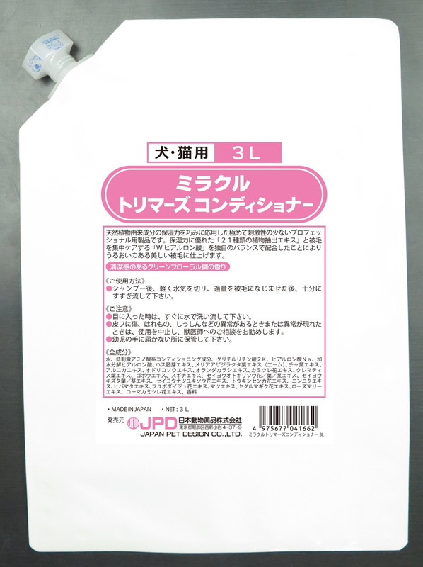 ● 天然植物由来成分の保湿力を巧みに応用した極めて刺激性の少ないプロフェッショナル用製品です。 ● 保湿力に優れた「21種類の植物抽出エキス」と被毛を集中ケアする「Wヒアルロン酸」を 独自のバランスで配合したことによりうるおいのある美しい被毛に洗い上げます。 ● 清潔感のあるグリーンフローラル調の香り