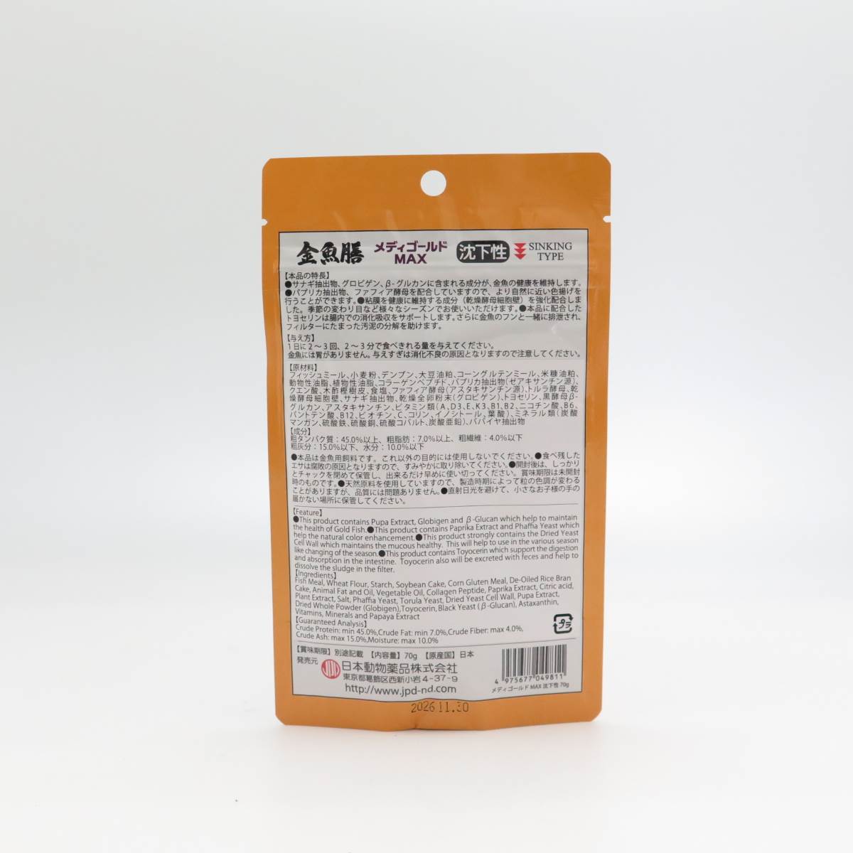 使用上の注意●本品は金魚用飼料です。これ以外の目的には使用しないでください。●食べ残したエサは腐敗の原因となりますので、すみやかに取り除いてください。●開封後は、しっかりとチャックを閉めて保管し、出来るだけ早めに使い切ってください。賞味期限は未開封時のものです。●天然原料を使用していますので、製造時期によって粒の色調が変わることがありますが、品質には問題ありません。●直射日光を避けて、小さなお子様の手の届かない場所に保管してください。