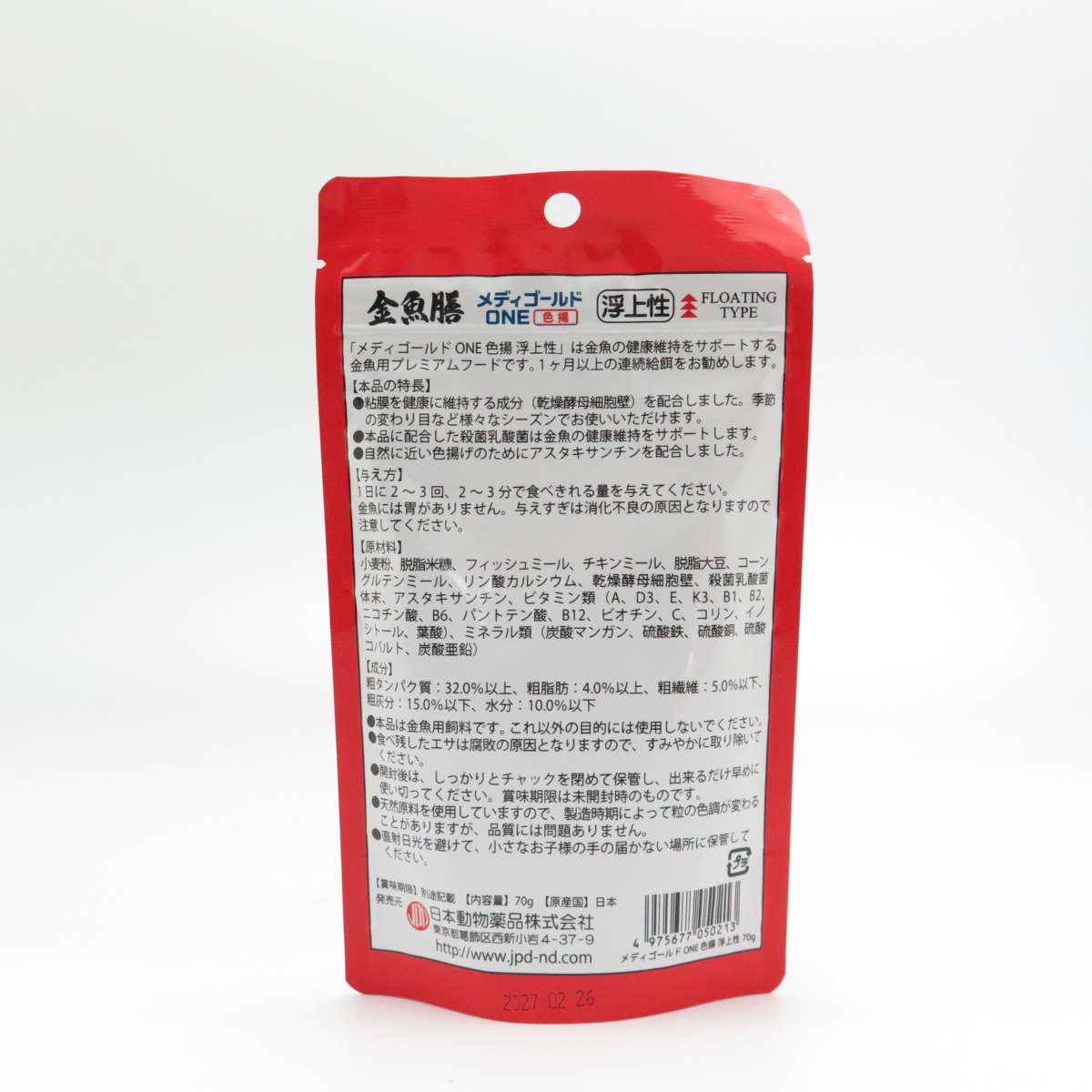 「メディゴールドONE 色揚 浮上性」は金魚の健康維持をサポートする金魚用プレミアムフードです。1ヶ月以上の連続給餌をお勧めします。【本品の特長】●粘膜を健康に維持する成分(乾燥酵母細胞壁)を配合しました。季節の変わり目など様々なシーズンでお使いいただけます。●本品に配合した殺菌乳酸菌は金魚の健康維持をサポートします。●自然に近い色揚げのためにアスタキサンチンを配合しました。