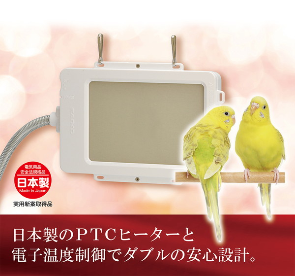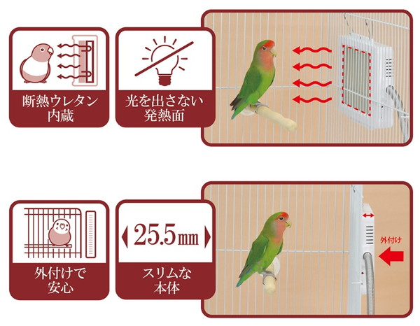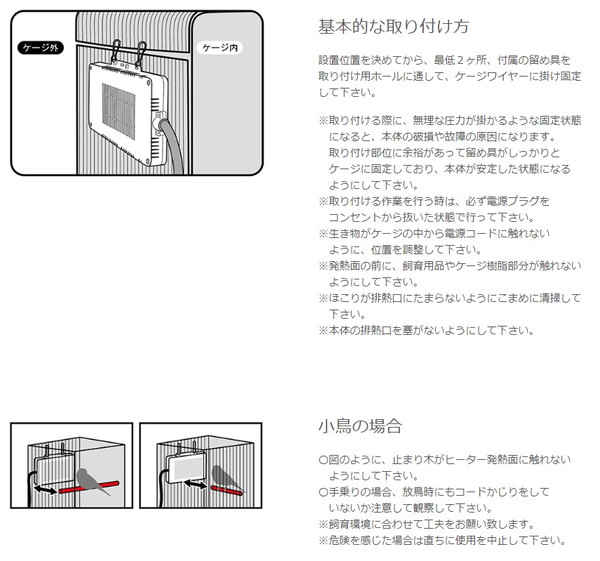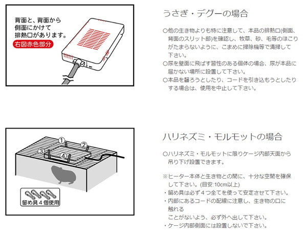 ※ケージ外付け型保温器具です。・本品は原則、飼育ケージのケージ網の外に取り付けて使用してください。・ハリネズミ、モルモットに限り、ケージ内部天面からつり下げ設置できます。※厳寒期等、外気温や環境温度が低い時は、目的温度に達するまでに時間が掛かる場合や温度が上がりきらない場合があります。他の保温器具の併用をおすすめします。