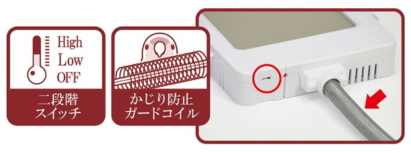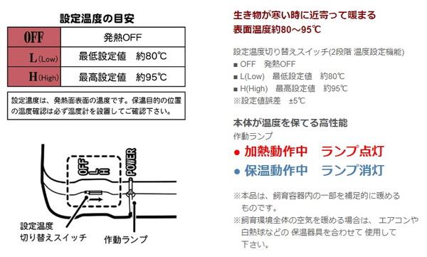 ※厳寒期等、外気温や環境温度が低い時は、目的温度に達するまでに時間が掛かる場合や温度が上がりきらない場合があります。他の保温器具の併用をおすすめします。
