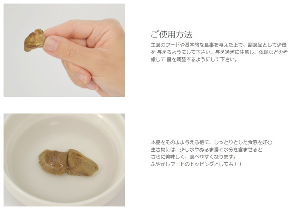 ※主食のフードや基本的な食事を与えた上で、副食品として少量を与えるようにしてください。与え過ぎに注意し、体調などを考慮して量を調整するようにしてください。