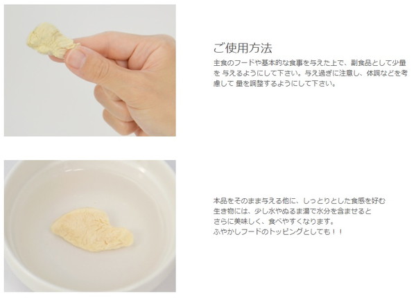 ※主食のフードや基本的な食事を与えた上で、副食品として少量を与えるようにしてください。与え過ぎに注意し、体調などを考慮して量を調整するようにしてください。