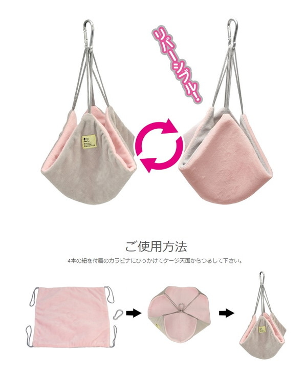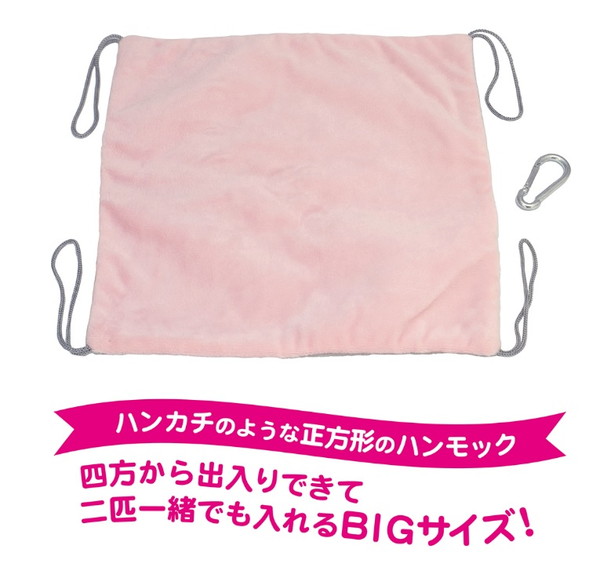 ハンカチのような正方形のハンモック。大きく開いて、お手入れ簡単!中から出てきてほしい時、簡単に大きく開くので生き物のストレスを軽減!