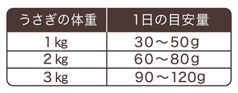 1日に与える量は、成体(親)うさぎの場合、体重に対して3~5%を目安に、体調や体格に合わせて調整し与えて下さい。