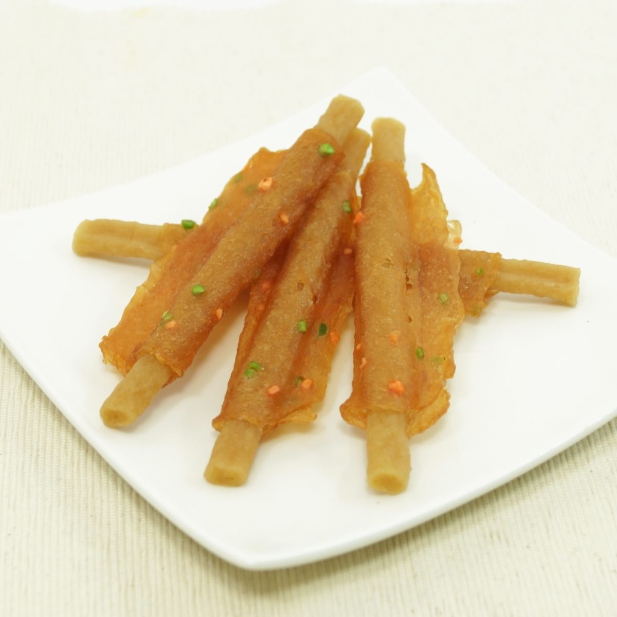 魚と鶏のコラーゲンスティックにササミを巻いたおやつ。野菜入り