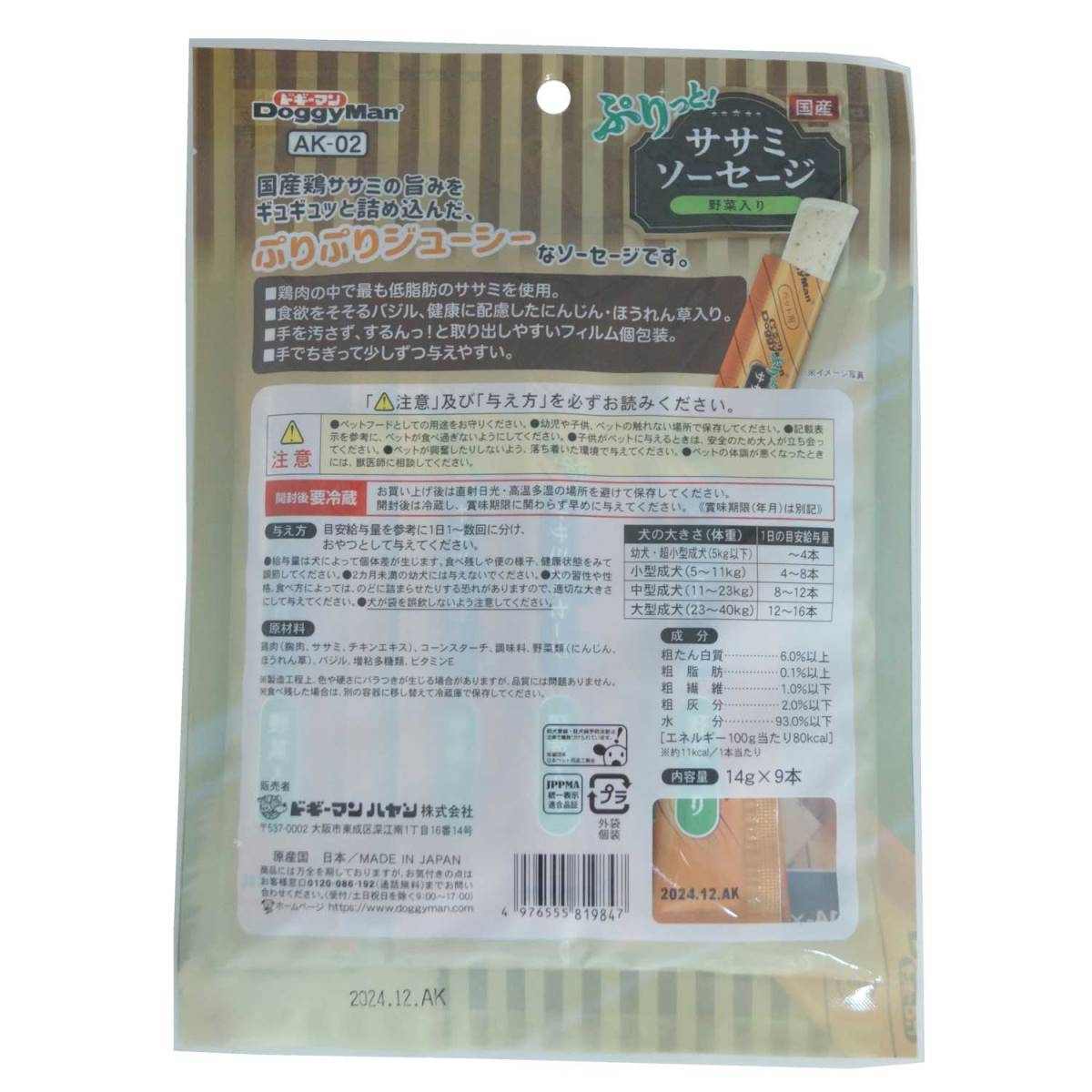 ドギーマン ぷりっと国産ササミソーセージ 野菜入り 14gX9本
