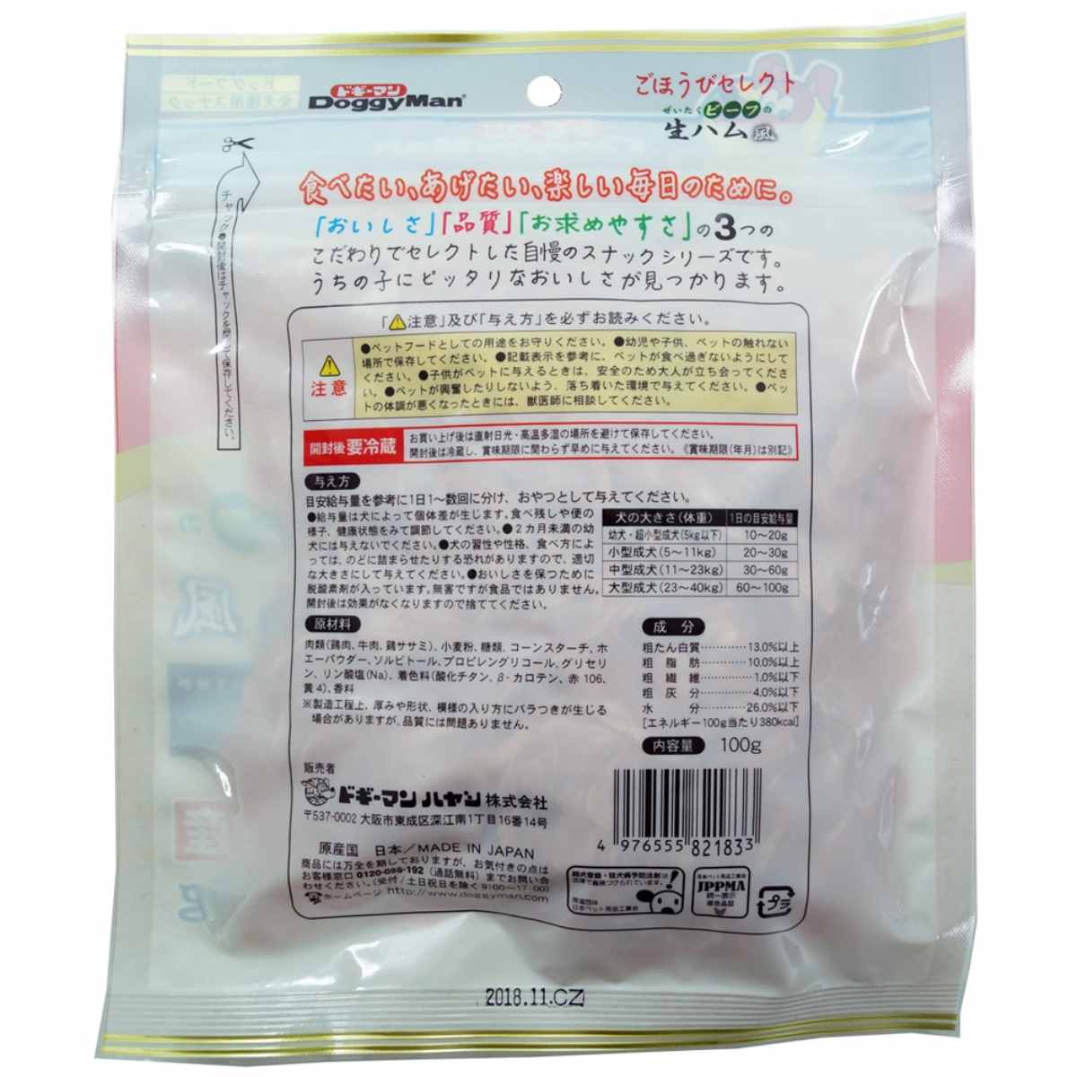 肉類(鶏肉、牛肉、鶏ササミ)、小麦粉、糖類、コーンスターチ、ホエーパウダー、ソルビトール、プロピレングリコール、グリセリン、リン酸塩、着色料、香料