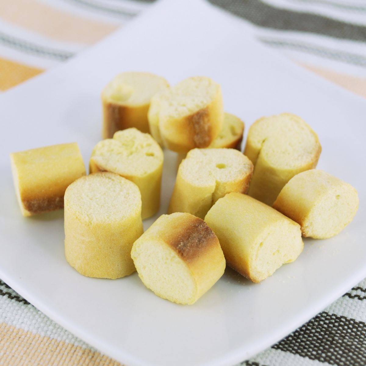 さつまいもを使用した、サクッと軽いおふのスナック。食物繊維豊富な「おから」、「オオバコ種皮」を配合。