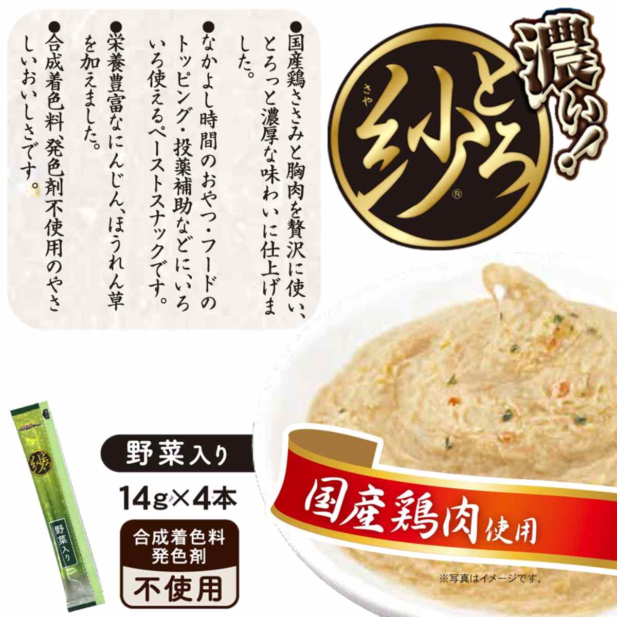 国産鶏ささみと胸肉を贅沢に使った、濃厚うまとろペーストおやつ。野菜入り。
