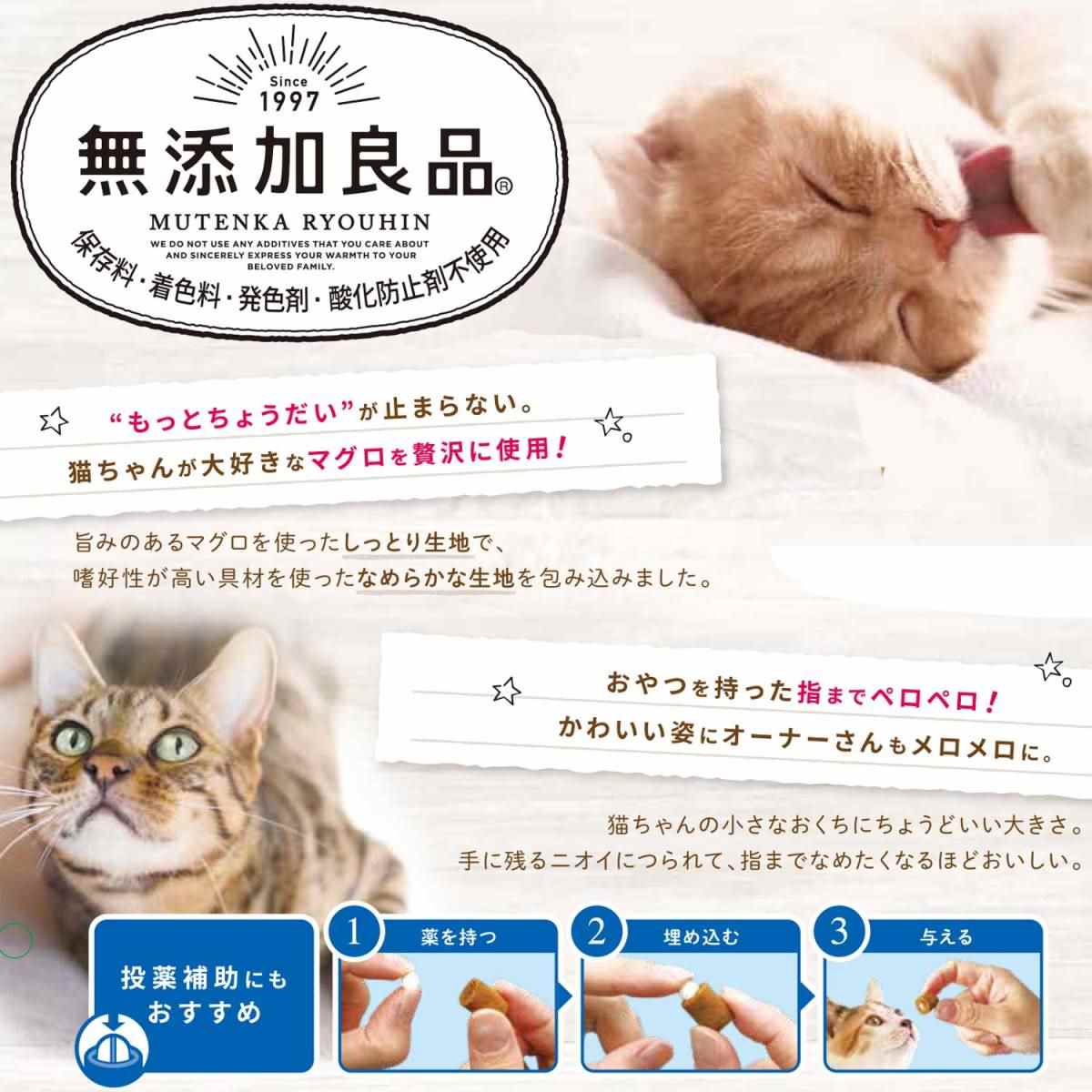 魚介類(まぐろ、タラ、かつお節)、鶏ササミ、コーンスターチ、鶏脂、食物繊維(セルロース)、増粘安定剤(寒天、グァーガム、ローカストビーンガム)、カゼインナトリウム、ミネラル類(ナトリウム)