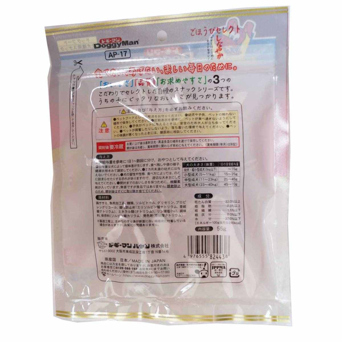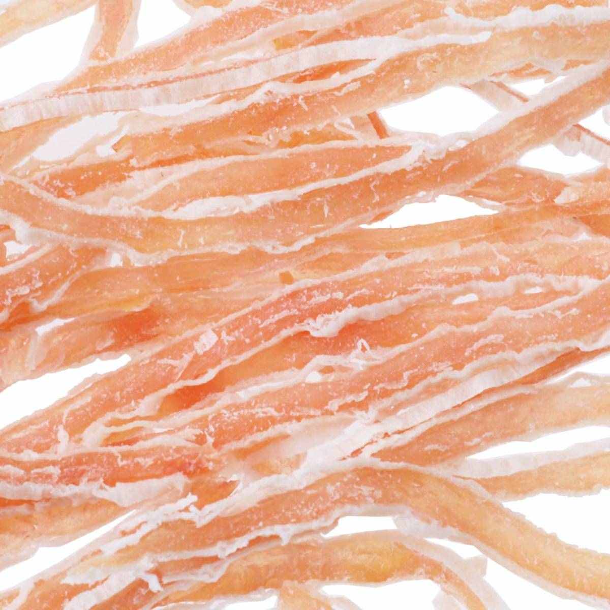 鶏ささみ生地を濃厚なおさかなのすり身でサンド。幼犬やシニア犬にちぎりやすく与えやすい極細仕上げ。
