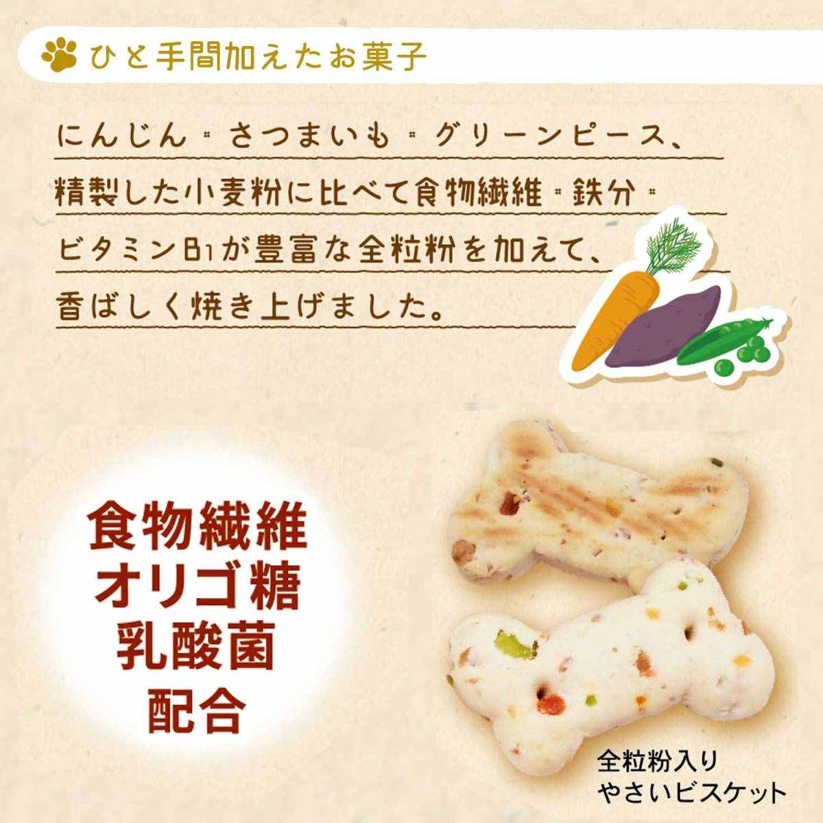 3つの野菜と全粒粉を使った香ばしいビスケット。乳酸菌配合。