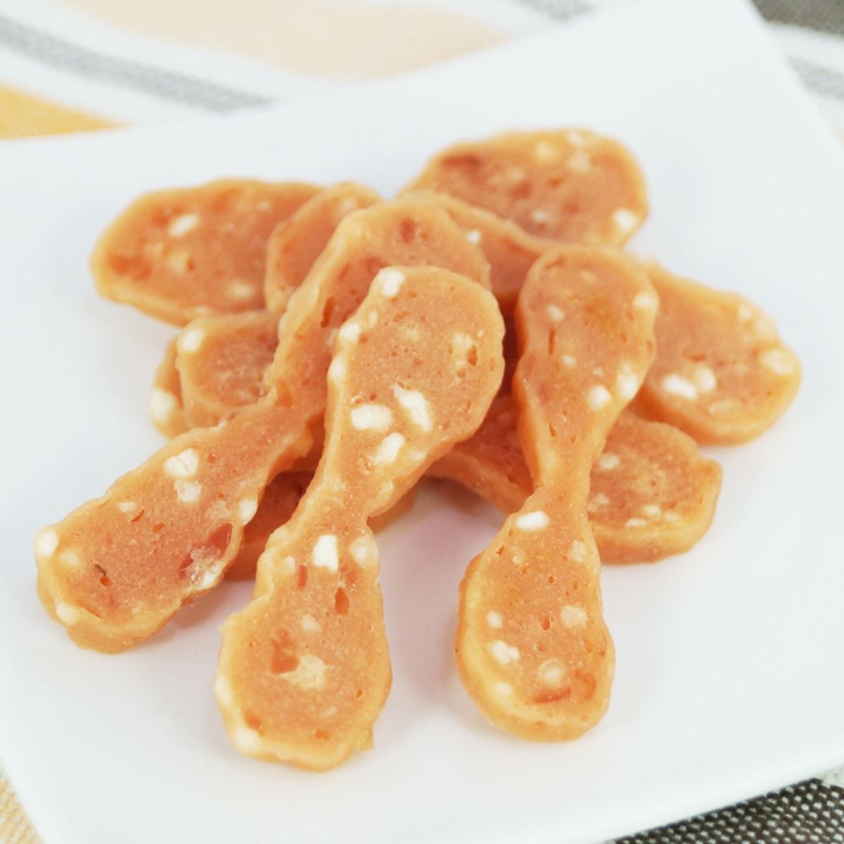くびれがありちぎりやすい形状。ササミを使ったやわらかおやつ。